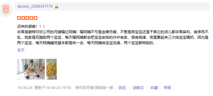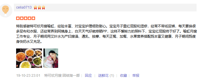 特可欣月嫂靠谱,喻红妈妈非常棒,照顾宝宝很专业,照顾产妇很周到,月子餐也很美味!