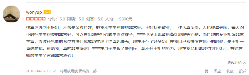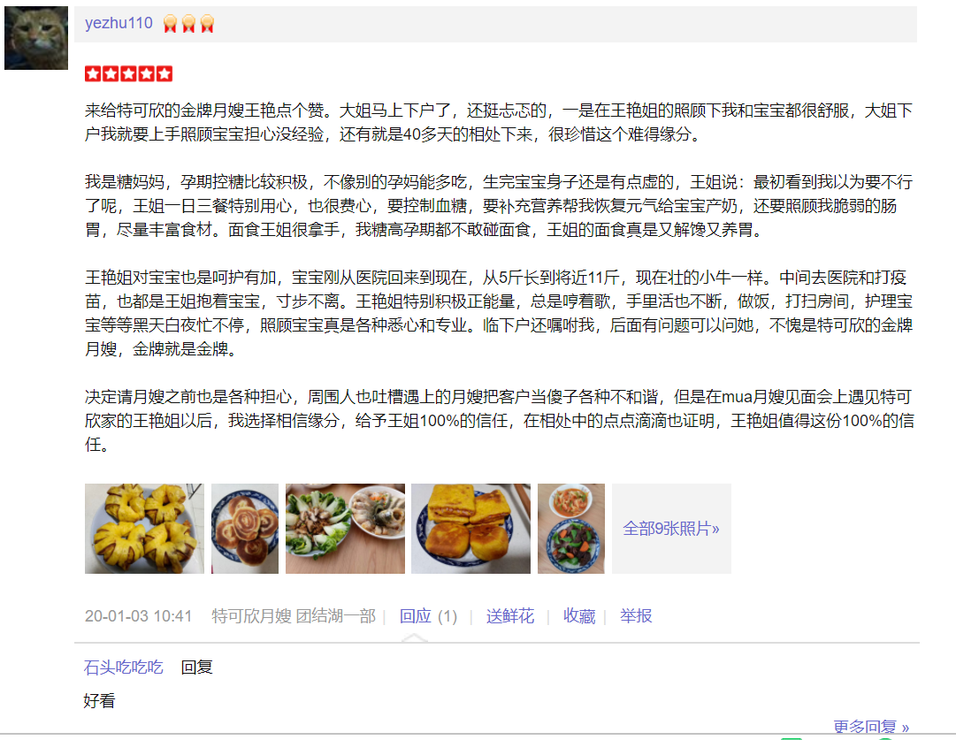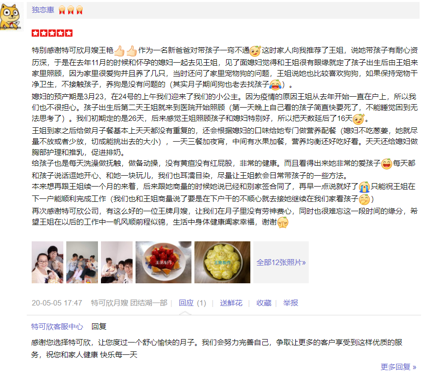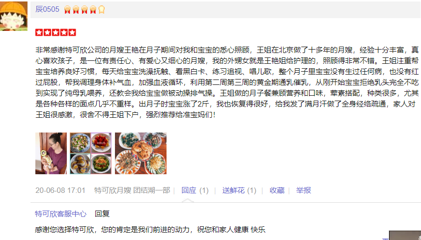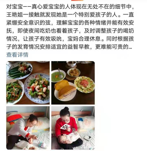 擅长月子餐、煲汤、产妇护理技能:月子营养配餐,催乳,形体修复,恶露观察及子宫复旧,心理疏导;产褥期科学指导;饮食调理的基础上配单独的穴位按摩,祛除体内湿毒。 工作期间能为客户着想能吃苦,又干净又勤劳,性格直爽,工作细心,认真,职业素养高。 厨艺好,每天根据产妇的身体需要,合理搭配很多样客户爱吃的饭菜。 擅长:按摩催乳,会调理奶量少。最主要的是王姐是发自内心的喜欢孩子,让每一位客户放心的把孩子交给她照顾。