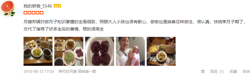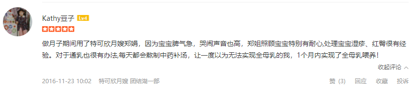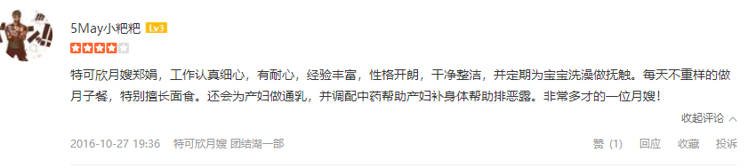 2007年从业特可欣,性格温顺,干净利落,精通婴儿早期开发,擅长产妇及婴儿护理。产妇护理技能:月子营养配餐,催乳,形体修复,子宫复旧,心理疏导;产褥期科学指导;婴儿护理技能:婴儿早教,洗澡,抚触,被动操,排气操,手指操;婴儿常见疾病的观察及预防指导:如:幽门痉挛,肠痉挛,黄疸观察,脐带消毒,鹅口疮,泪囊阻塞,尿布疹,湿疹等;婴儿大小便的观察,啼哭的观察等等;座右铭:做就做最好的