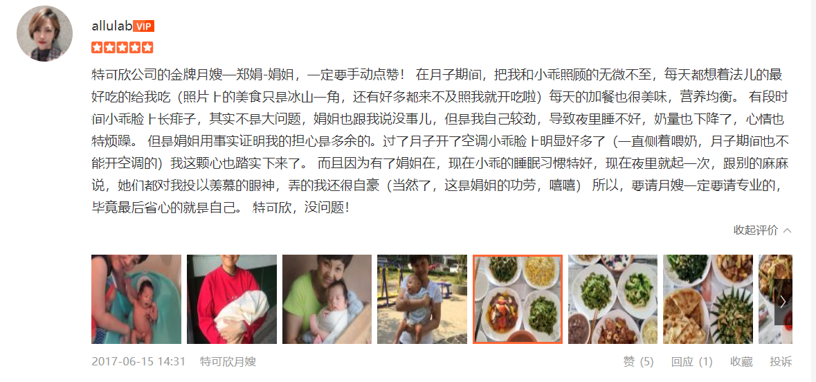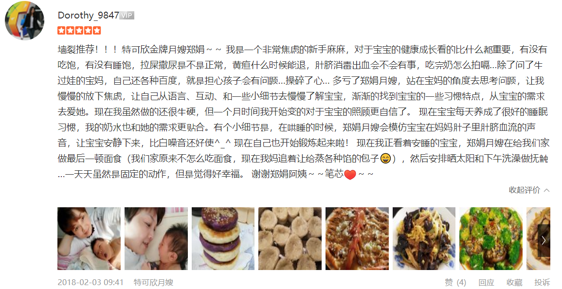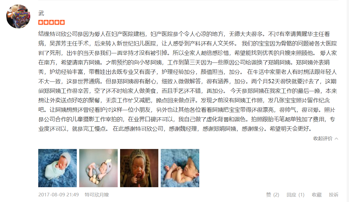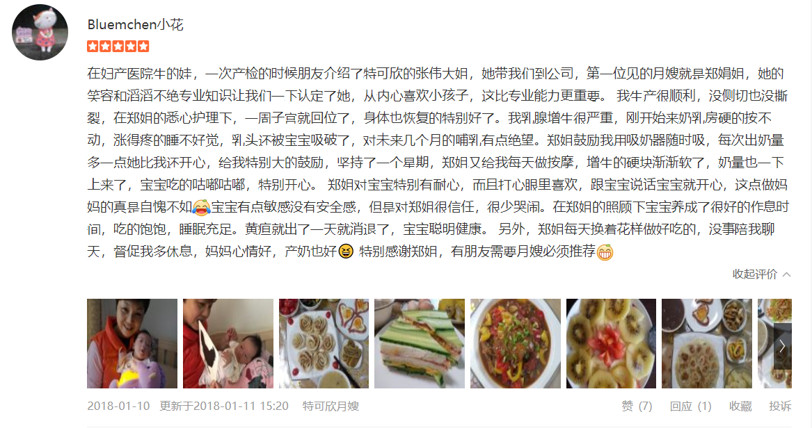 2007年从业特可欣,性格温顺,干净利落,精通婴儿早期开发,擅长产妇及婴儿护理。产妇护理技能:月子营养配餐,催乳,形体修复,子宫复旧,心理疏导;产褥期科学指导;婴儿护理技能:婴儿早教,洗澡,抚触,被动操,排气操,手指操;婴儿常见疾病的观察及预防指导:如:幽门痉挛,肠痉挛,黄疸观察,脐带消毒,鹅口疮,泪囊阻塞,尿布疹,湿疹等;婴儿大小便的观察,啼哭的观察等等;座右铭:做就做最好的