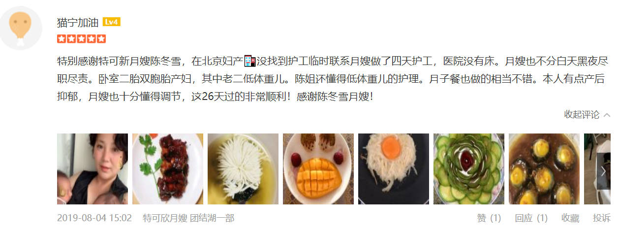 2008年开始从事月嫂工作,有爱心耐心责任心,擅长催乳,月子餐的营养搭配,沟通能力强。产妇护理技能:乳房护理,月子餐制作,产褥期科学指导,剖腹产,顺产侧切伤口的护理,子宫复旧等。婴儿护理技能:洗澡,抚触,被动操,排气操,黄疸观察,脐带消毒,湿疹,臀红,尿布疹等新生儿常见疾病的观察及预防指导等。座右铭是:一直被模仿,从未被超越。 职业证书:母婴护理师,催乳师,营养师,,产后修复师,早教指导师,早产儿护理证,小儿推拿,心理咨询师