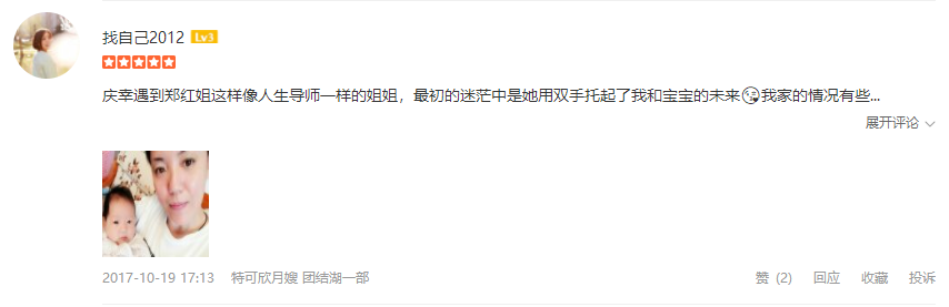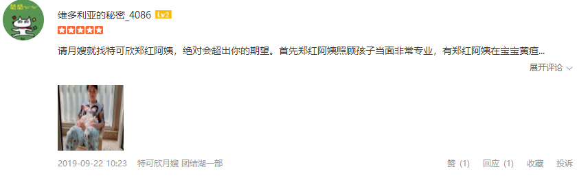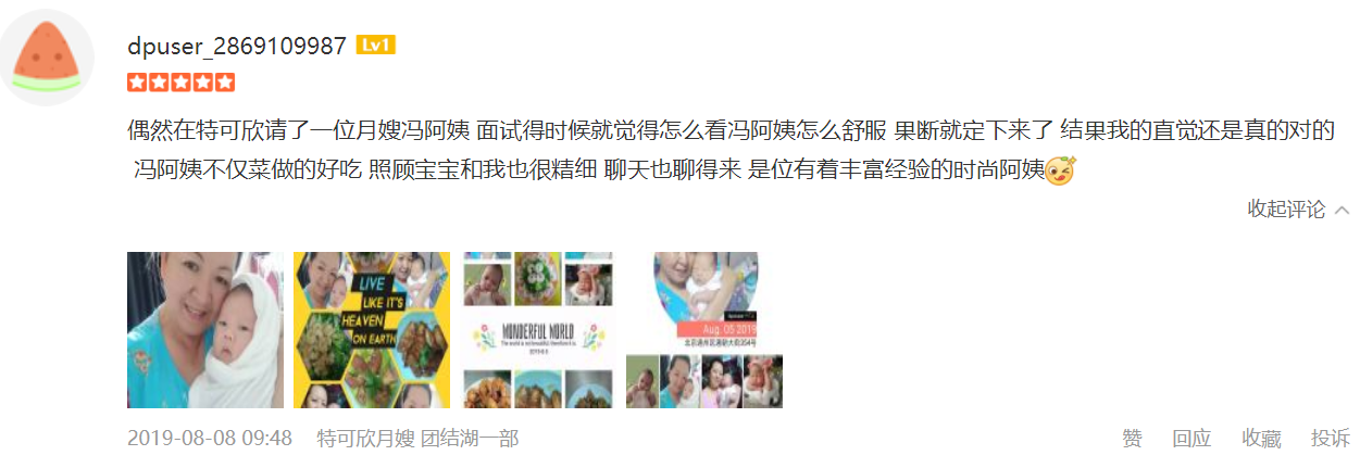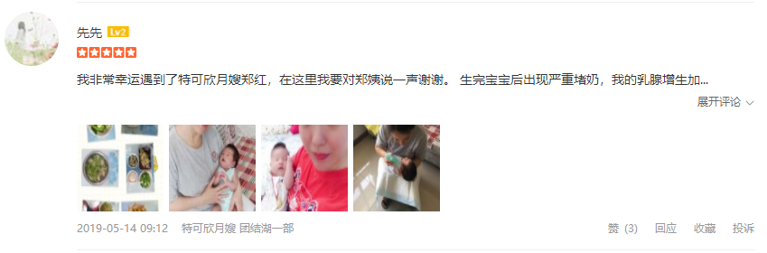 2010年从业特可欣,做事勤快、厨艺好。性格开朗,喜欢孩子,好沟通。擅长产妇及婴儿护理。产妇护理技能:剖腹产及侧切伤口护理,心理疏导,催乳,子宫复旧等;婴儿护理技能:洗澡,抚触,被动操,排气操,婴儿常见疾病观察及预防指导等。