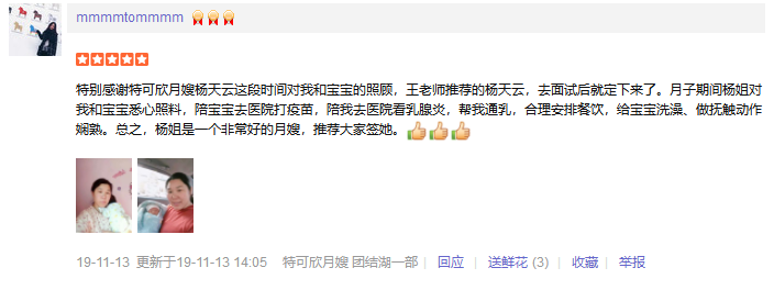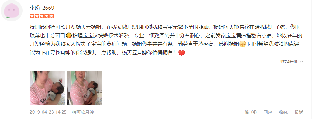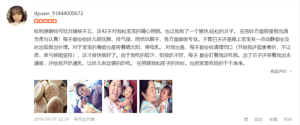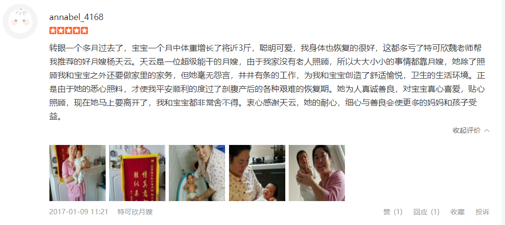 2010年从业特可欣,擅长产妇及婴儿护理。产妇护理技能:催乳,产褥汗科学指导(可从食疗,护理,穴位多方面护理)恶露观察,子宫复旧,心理健康指导 婴儿护理技能:抚触,被动操,排气操,洗澡,游泳,脐带消毒,常见病的观察与预防指导(如:黄疸,湿疹,臀红,泪囊阻塞,鹅口疮,幽门痉挛,肠痉挛)月嫂座右铭:您的需要是我最大的幸福,感恩遇见