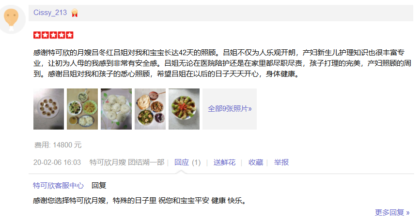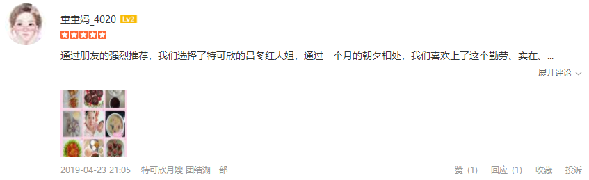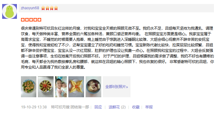 感谢北京特可欣月嫂公司,通过介绍认识了吕冬红阿姨,阿姨人热情开朗,护理宝宝有8年的工作经验,工作细心,烧得一手色香味俱全,营养搭配均衡的月子餐,16年生老大就是吕阿姨护理了26天,宝宝护理的特别好,我和婆婆都特别放心。知道怀了老二后,第一时间联系了吕阿姨,预约好了档期,这次订了42天,再次感谢阿姨的细心呵护。希望吕阿姨今后的日子工作顺利,越来越漂亮!18-10-17 09:44