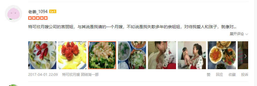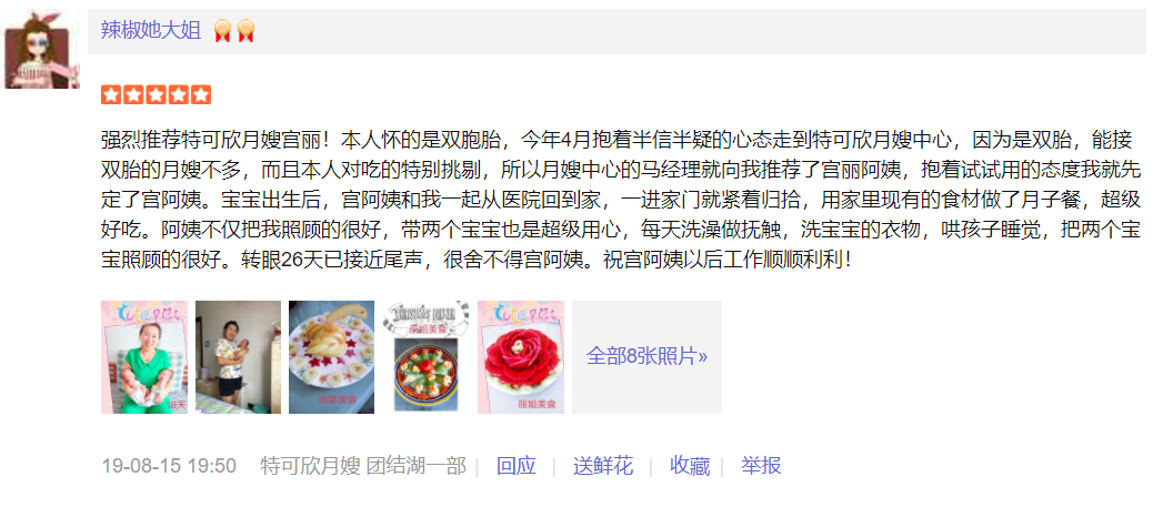 特别感谢特可欣公司王艳老师推荐的宫丽阿姨,<br/>在家里特别精心照顾我和宝宝,每天为我搭配营养丰富的月子餐,因为我们家是双胞胎,我身体恢复的比较慢,刚开始时候还特别虚弱,宫姐每天切水果,倒水,,坐月子餐也是变着花样的做,有空就给宝宝洗衣服,每个小细节都想得特别周到,和家人相处的十分融洽,特别随和,性格开朗,帮助产妇保持好心情。晚上白天都照顾宝宝,两个宝宝睡觉时间不长,起夜次数频繁,很是辛苦。来到家里,我都特别放心,踏实。纯母乳喂养,吸吮时间长,还容易堵,导致发烧,宫丽阿姨的照顾下帮我几次通乳,及时退烧。每天宫丽做好记录,包括喂养时间,大小便时间,次数等,感谢细心照顾我和宝宝,感谢她一个月的陪伴,祝她以后工作顺利,身体健康。18-12-11 18:42