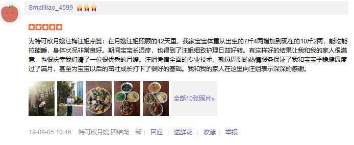 特可欣月嫂汪梅靠谱非常棒,照顾宝宝很专业,照顾产妇很周到,月子餐做的很好吃,还帮着做家务,很细心有责任感,还会通乳,很不错。18-08-27 16:57