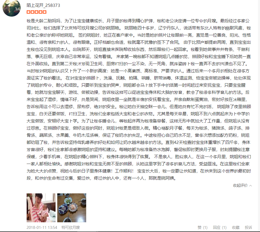 感谢特可欣月嫂的姚丽艳阿姨,她在我家呆了26天,对孩子非常认真负责,性格也非常好,很有爱心,对孩子也很有耐心,我家宝宝算比较难带的,平时哭闹,她非常有耐心的哄,刚回来时我奶堵了,每天晚上她都给我做按摩到很晚,让我少受好多罪,我再次感谢阿姨,在平时孩子不闹的情况下她帮我家把家务都做了,真的很勤快,我们在一起这26天每天都有欢笑,很融洽,她头走时我们都很不舍,我很感谢阿姨这26天对我和宝宝的照顾,我真心推荐孕妈可以找她做月嫂,保证你们会和我一样的感受。