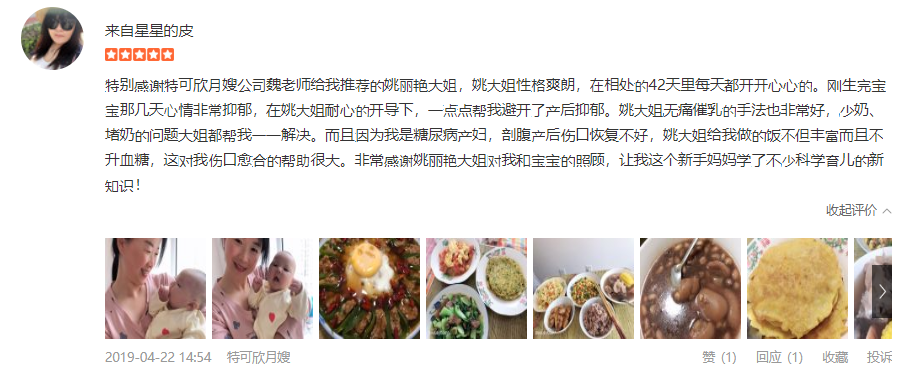 非常感谢姚阿姨在我家担当月嫂期间工作认真负责、技术娴熟、服务态度真诚热情、在照顾产妇上姚阿姨悉心周到、宝宝的日常护理同样做的很好每天一次的洗澡抚触观察宝宝的发育情况、并教授我们宝宝日常护理、我非常乐意将这么好的月嫂推荐给我的朋友!