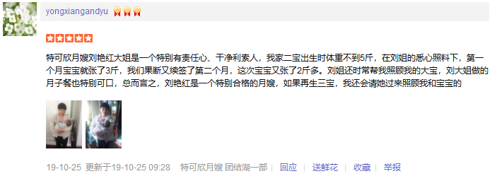 经特可欣的张伟老师推荐了月嫂刘艳红,张伟老师还送了大礼包:尿不湿、储奶杯、婴儿袜子、围嘴、纱布手绢、帽子。月嫂刘姐人很好,脾气温和,喜欢孩子,孩子哭闹她也能耐心的对待,做事认真仔细,干净利落,每天都叫我起床按时吃饭,按时喂奶,帮我通乳,还开导我生活中的困惑,孩子和我家人都很喜欢她。刘姐走后我还真想念他,她的声音还能随时在我耳边响起,感谢刘姐!有需要月嫂的朋友可以选择她!也感谢张伟老师的良心推荐!18-11-17 20:32