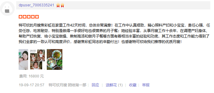 2005年从事月嫂工作,性格开朗随和,善于沟通,出生在甘肃,四川生活,擅长南北方菜系。护理方面擅长产妇及婴儿的护理,产妇方面:顺产及剖腹产,早产儿,双胞胎的护理等,实际操作:乳房护理通乳,子宫复旧,产褥汗科学指导,恶露观察;婴儿护理:早期智力开发,日常生活护理,常见疾病观察及预防,如:湿疹/臀红/幽门痉挛/肠痉挛/黄疸/泪囊阻塞等;实际操作:被动操,婴儿抚触,排气操,脐部护理等;月嫂座右铭:呵护好每一位新妈妈,照顾好每一个小天使
