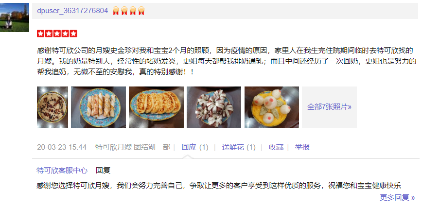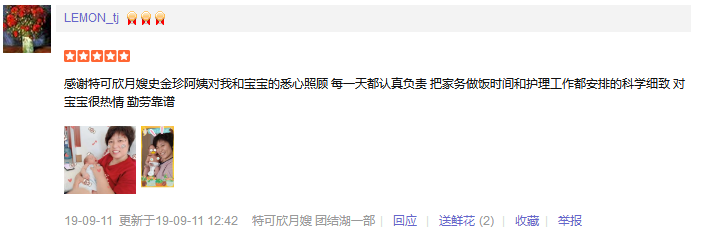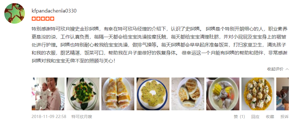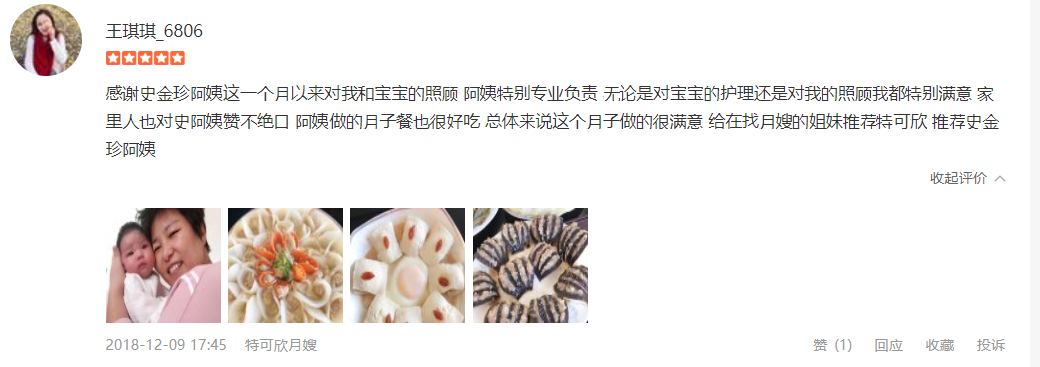 特可欣史金珍月嫂是我的第二个月嫂,史姐性格开朗有趣,干活干净利落,我妈特别喜欢,直说特别合拍。史姐照顾宝宝特别细致耐心,也很专业。我月子期间两次堵奶,也多亏了史姐帮忙通奶。史姐做饭也很贊,种类多样。月子接近尾声,特别舍不得史姐,感激~