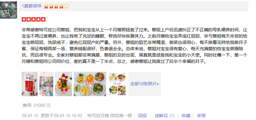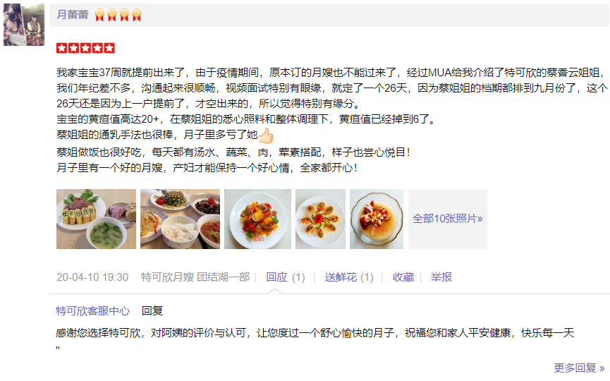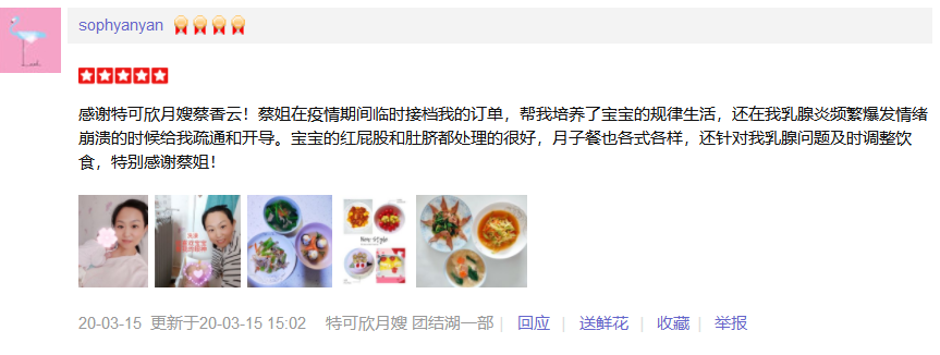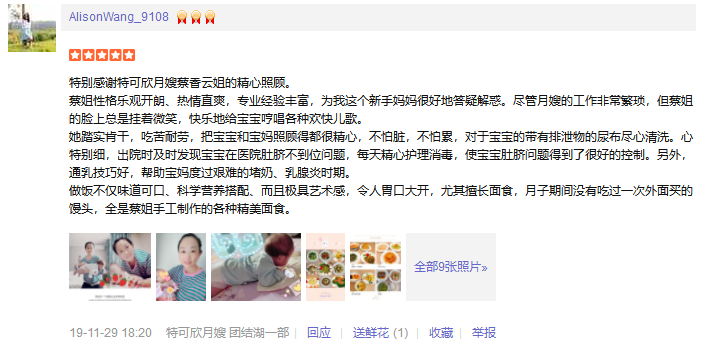 特别感谢特可欣公司张伟老师推荐的蔡香云阿姨,在家里特别精心照顾我和宝宝,每天为我搭配营养丰富的月子餐,因为我身体恢复的比较慢,小蔡刚来的时候还特别虚弱,在她的照顾下一天天好起来,每天切水果,倒水,每一个小细节都想得特别周到,和家人相处的十分融洽,特别随和,性格开朗,帮助产妇心情特别好。晚上白天都独自照顾宝宝,为了让我好好休息,全心全意看护宝宝,从小蔡来到家里,我都特别放心,踏实。小蔡照顾宝宝更是专业,因为我是混合喂养,乳头扁平,吃奶也很费劲,在小蔡的照顾下都显得井井有条,每天小蔡做好记录,包括喂养时间,大小便时间,次数等等。感谢蔡阿姨细心照顾我和宝宝,感谢小蔡三个月的陪伴。感谢特可欣提供的优质服务。补充:小蔡给家里做的面食及各种搭配特别好,孩子在小蔡怀里特别温暖。18-11-26 12:20