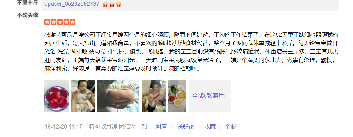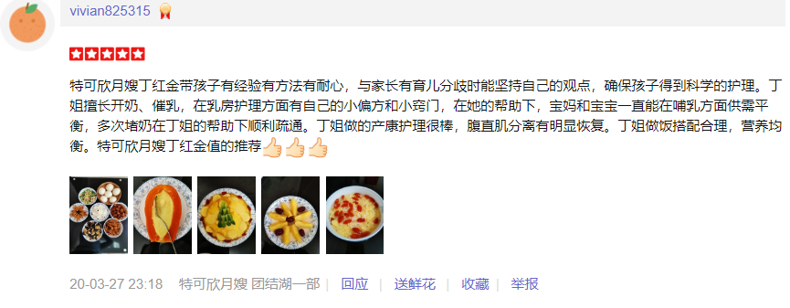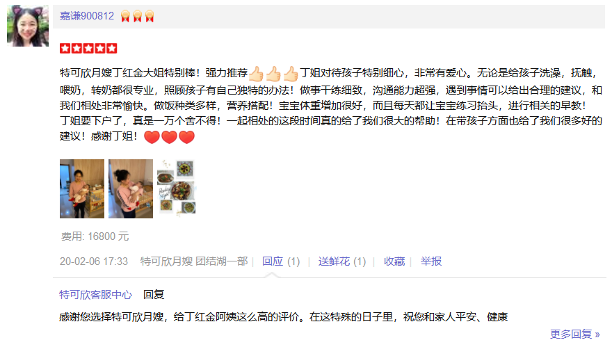 2012年加入特可欣做月嫂 ,其中包括十几个早产儿,护理过的新生儿都很健康,善于不断总结经验,给宝妈传授经验,育儿理念新颖易懂,紧跟时代。擅长产妇及婴儿护理; 产妇护理技能:催乳,身体按摩排毒,月子餐制作,产褥期科学指导,心理健康指导等。 婴儿护理技能:洗澡,抚触,被动操,脐部护理,黄疸观察,湿疹臀红的预防指导,婴儿早教等