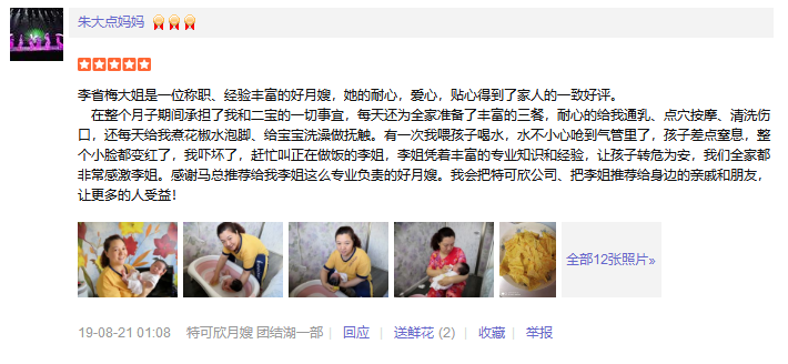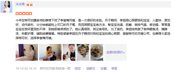 2012年从业特可欣,热爱本职工作,有爱心、耐心责任心,性格稳重,工作踏实,擅长母婴护理。婴儿护理技能:洗澡,抚触,被动操,排气操,婴儿早教,常见病的观察及预防等; 产妇护理技能:乳房的基础护理,月子餐的科学配置,褥汗的观察,恶露的观察,子宫复旧等