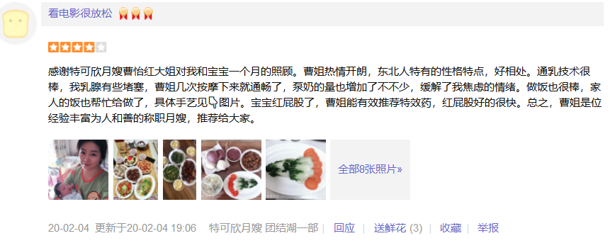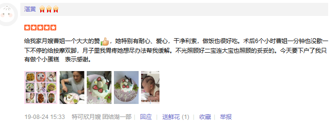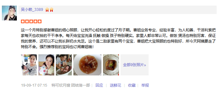 2014年起从事特可欣,热爱本职工作,勤劳善良,干净利落,沟通好。擅长月子餐制作,厨艺好。产妇几婴儿护理专业。产妇护理:子宫复旧,乳房护理,恶露观察,产褥汗科学指导; 婴儿护理:洗澡,游泳;黄疸观察,脐部护理,湿疹;臀红;尿布疹;等观察及预防;抚触,被动操;排气操等实际操作。月嫂座右铭:服务好每一位客户