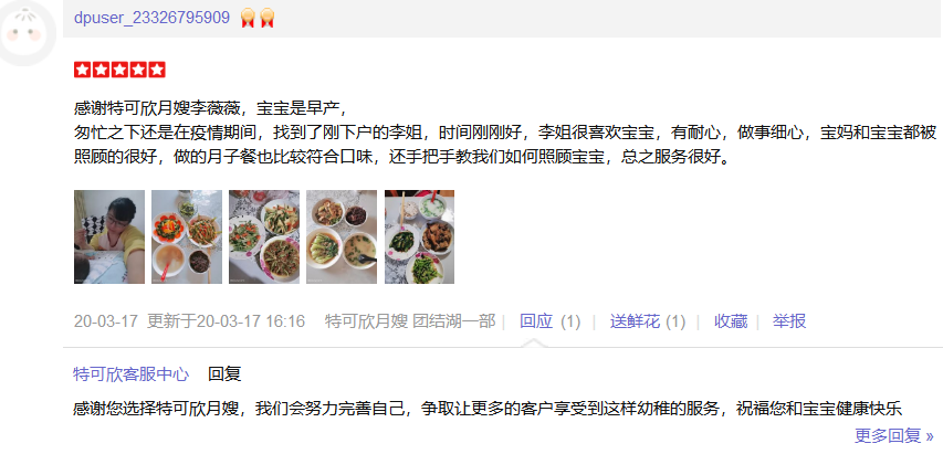 2015年加入特可欣,热爱本职工作,性格开朗,温柔稳重,沟通能力强,擅长月子餐营养搭配、乳房护理。婴儿护理技能:洗澡、抚触、脐部护理、被动操、排气操、大小便的观察以及婴儿常见病症的观察及预防。