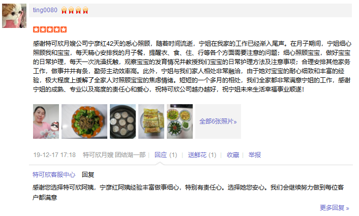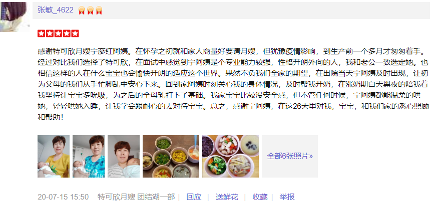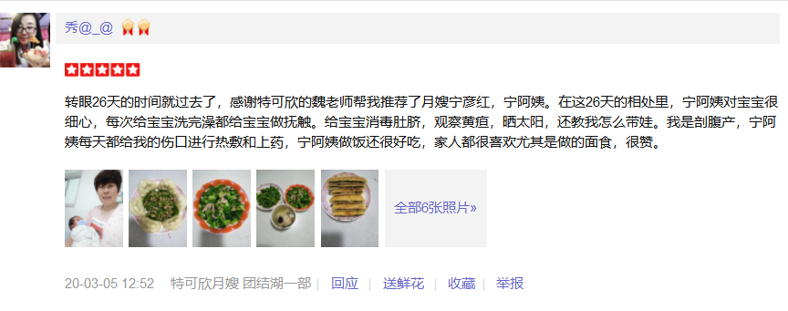 2016年加入特可欣做月嫂,因为喜欢宝宝选择这个职业,有爱心、耐心、责任心、擅长面食、月子餐营养搭配、乳房护理。其中照顾过糖尿病和回民产妇。婴儿护理技能:洗澡、抚触、脐部护理、被动操、排气操、大小便的观察以及婴儿常见病症的观察及预防。