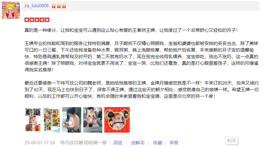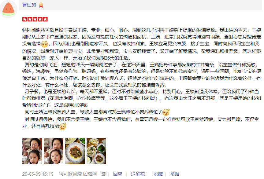 2012年从业特可欣,性格开朗,有责任心有耐心。可带双胎及早产儿。产妇护理技能:催乳,月子餐营养搭配,产褥期科学指导、恶露的观察、子宫复旧等;婴儿护理技能:洗澡、游泳、被动操、排气操、抚触、脐带消毒、黄疸观察、湿疹、臀红的护理等。