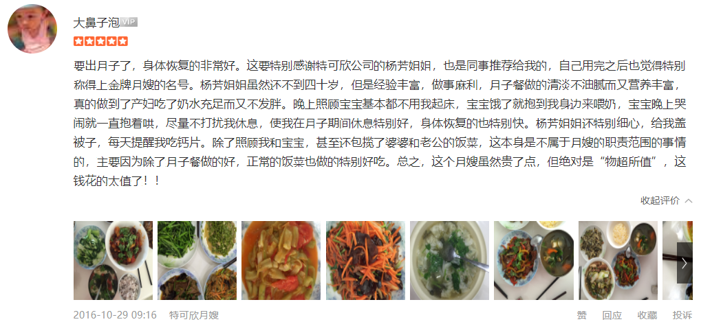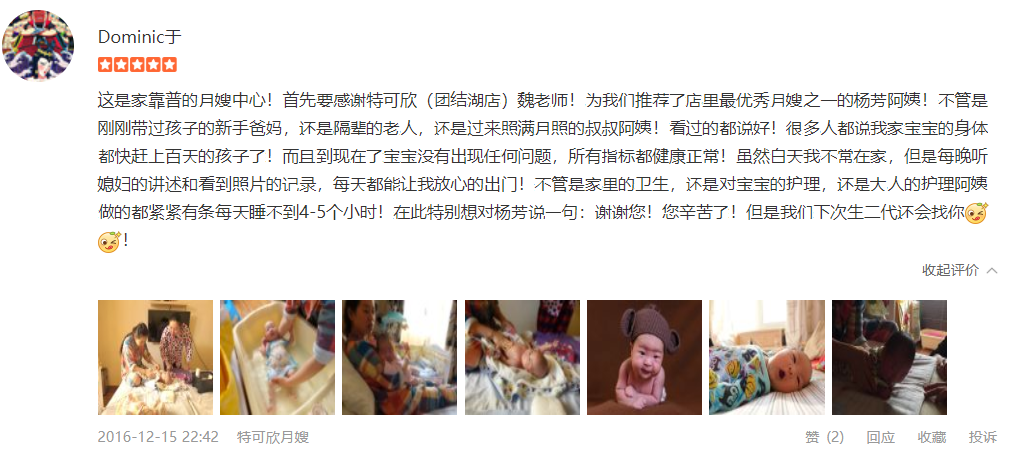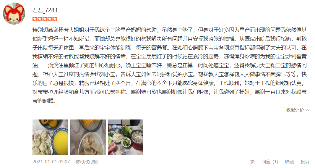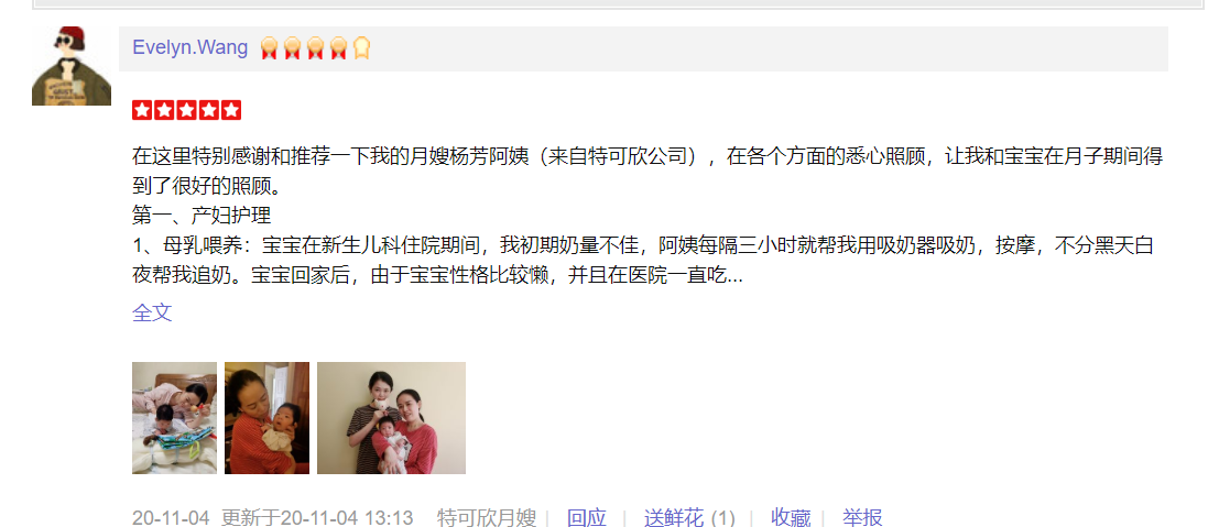 2006年从业特可欣,明星护理师,性格温柔,善解人意,服务周到!经验丰富,擅长产妇催乳,子宫复旧,形体恢复、心理疏导、月子餐配制。对宝宝常见病的观察及处理很专业。擅长宝宝早教,洗澡,抚触,被动操等技能操作,不会让您的宝宝输在起跑线上。