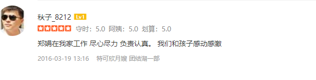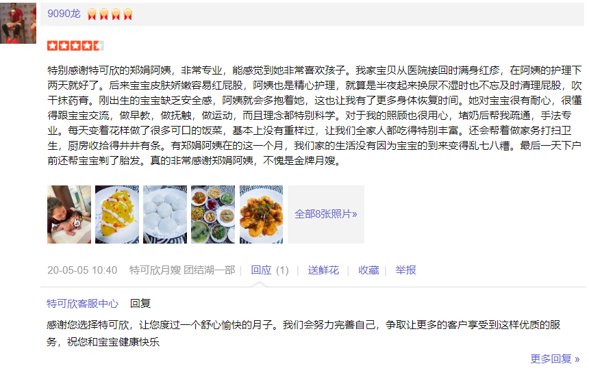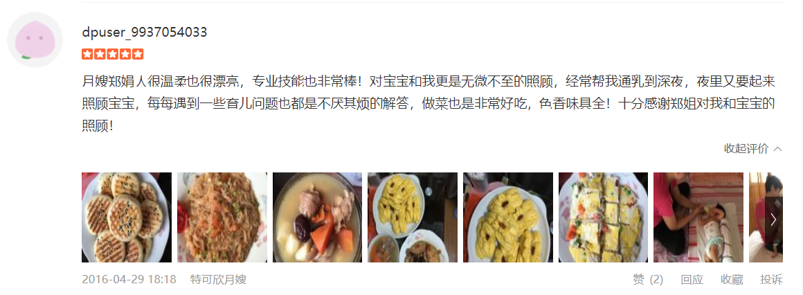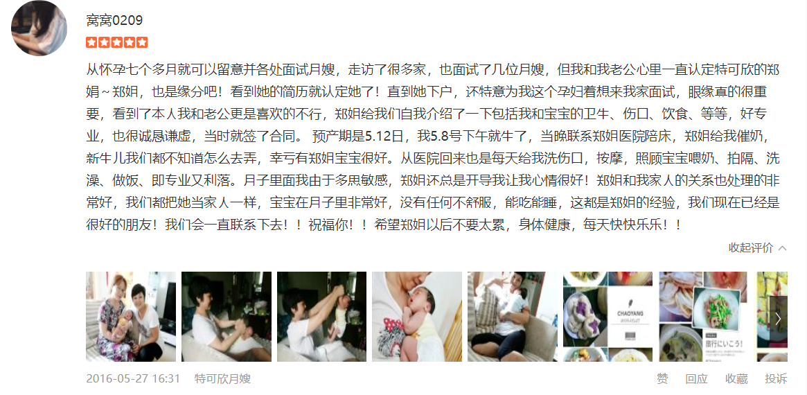 2007年从业特可欣,性格温顺,干净利落,精通婴儿早期开发,擅长产妇及婴儿护理。产妇护理技能:月子营养配餐,催乳,形体修复,子宫复旧,心理疏导;产褥期科学指导;婴儿护理技能:婴儿早教,洗澡,抚触,被动操,排气操,手指操;婴儿常见疾病的观察及预防指导:如:幽门痉挛,肠痉挛,黄疸观察,脐带消毒,鹅口疮,泪囊阻塞,尿布疹,湿疹等;婴儿大小便的观察,啼哭的观察等等;座右铭:做就做最好的