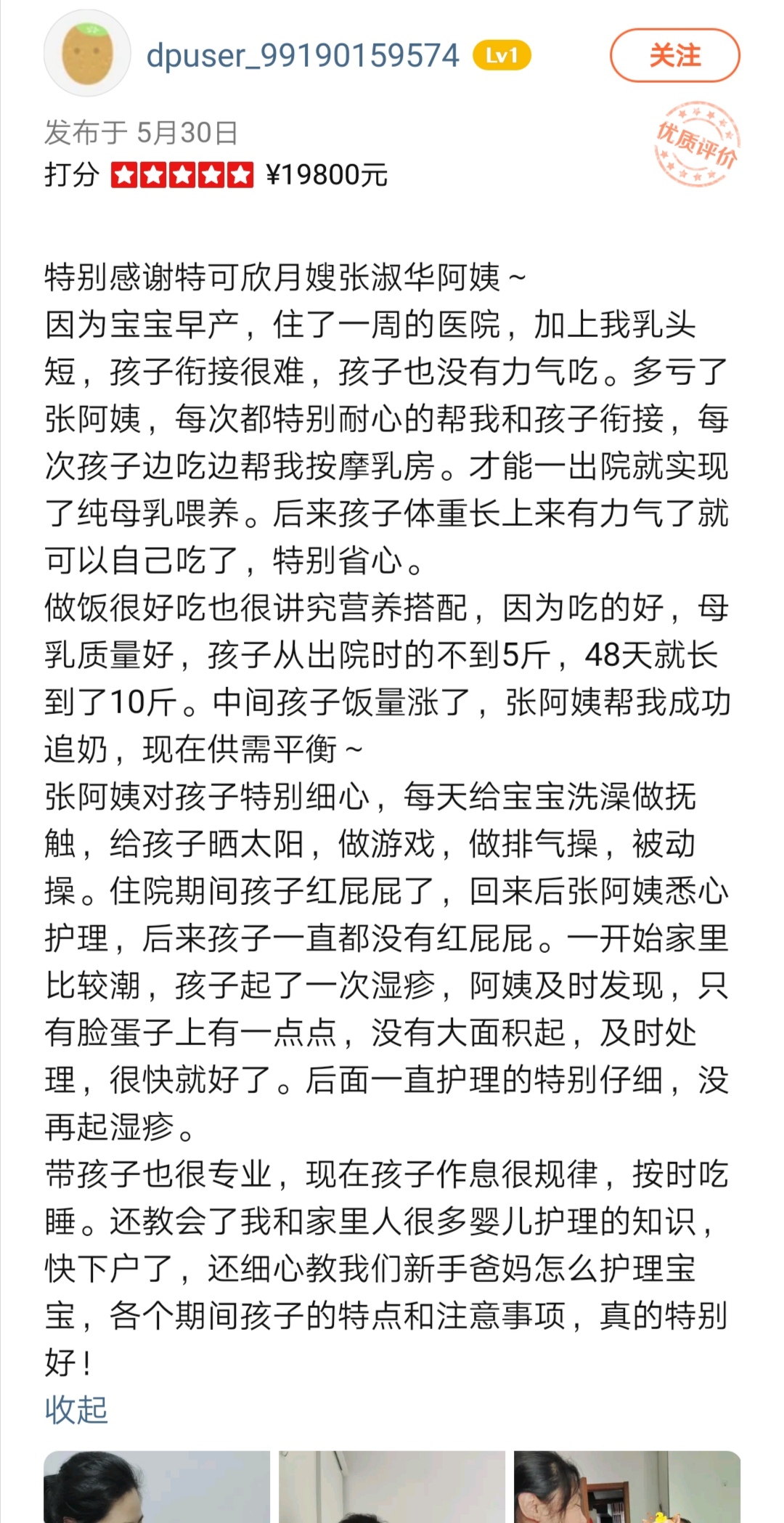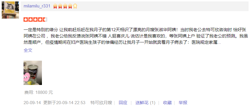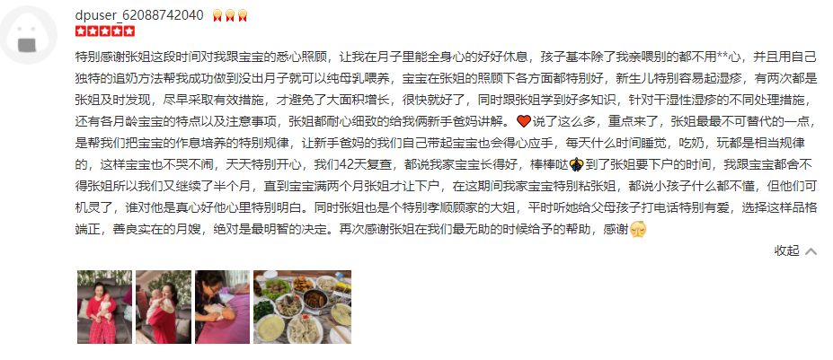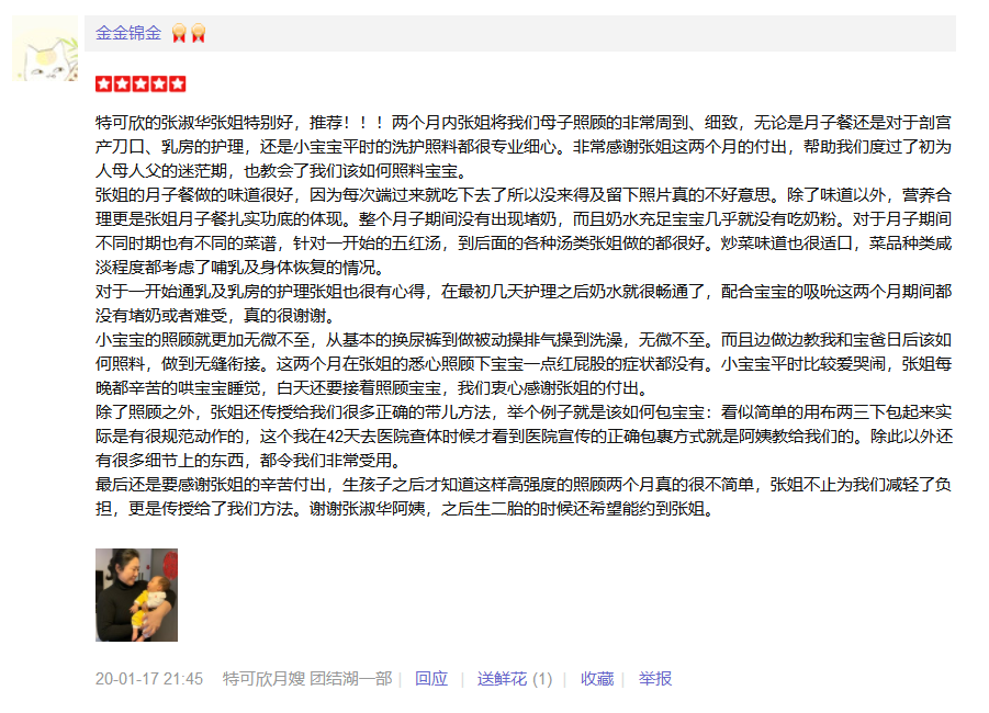 2007年从业特可欣,明星护理师,性格善良,擅长双胞胎,早产儿,婴儿特殊疾病护理,如吸入性肺炎,先心病,肠梗阻等;产妇护理技能:乳房护理,月子餐制作,产褥期科学指导,剖腹产,顺产侧切伤口的护理,子宫复旧等。婴儿护理技能:洗澡,抚触,被动操,排气操,黄疸观察,脐带消毒,湿疹,臀红,尿布疹等新生儿常见疾病的观察及预防指导等。