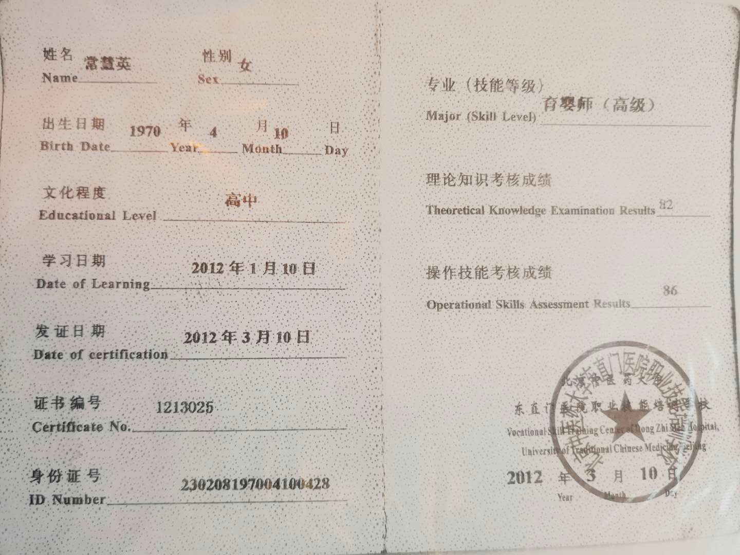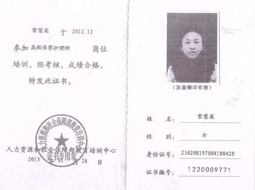 2008年从业特可欣,性格开朗,勤劳肯干,沟通能力强。擅长产妇及婴儿护理。产妇护理技能:月子营养配餐,催乳,形体修复,恶露观察及子宫复旧,心理疏导;产褥期科学指导;饮食调理的基础上配单独的穴位按摩,祛除体内湿毒,婴儿护理技能:婴儿早教,洗澡,抚触,被动操,排气操,手指操;婴儿常见疾病的观察及预防指导:如:幽门痉挛,肠痉挛,黄疸观察,脐带消毒,鹅口疮,泪囊阻塞,尿布疹,湿疹等;婴儿大小便的观察,啼哭的观察等等;座右铭:用我的安心责任心让您度过一个温馨科学的产褥期!