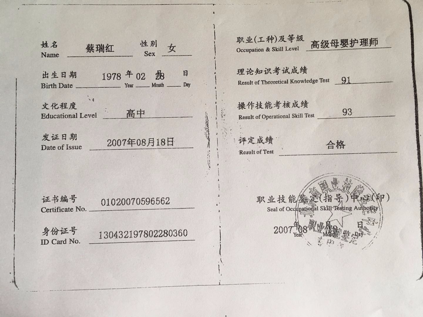 证书:母婴护理师 催乳师