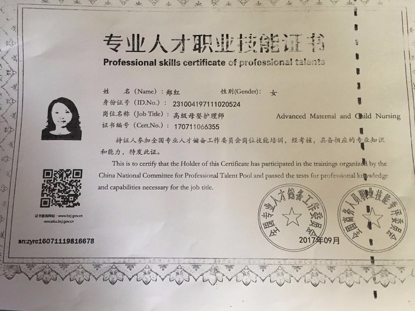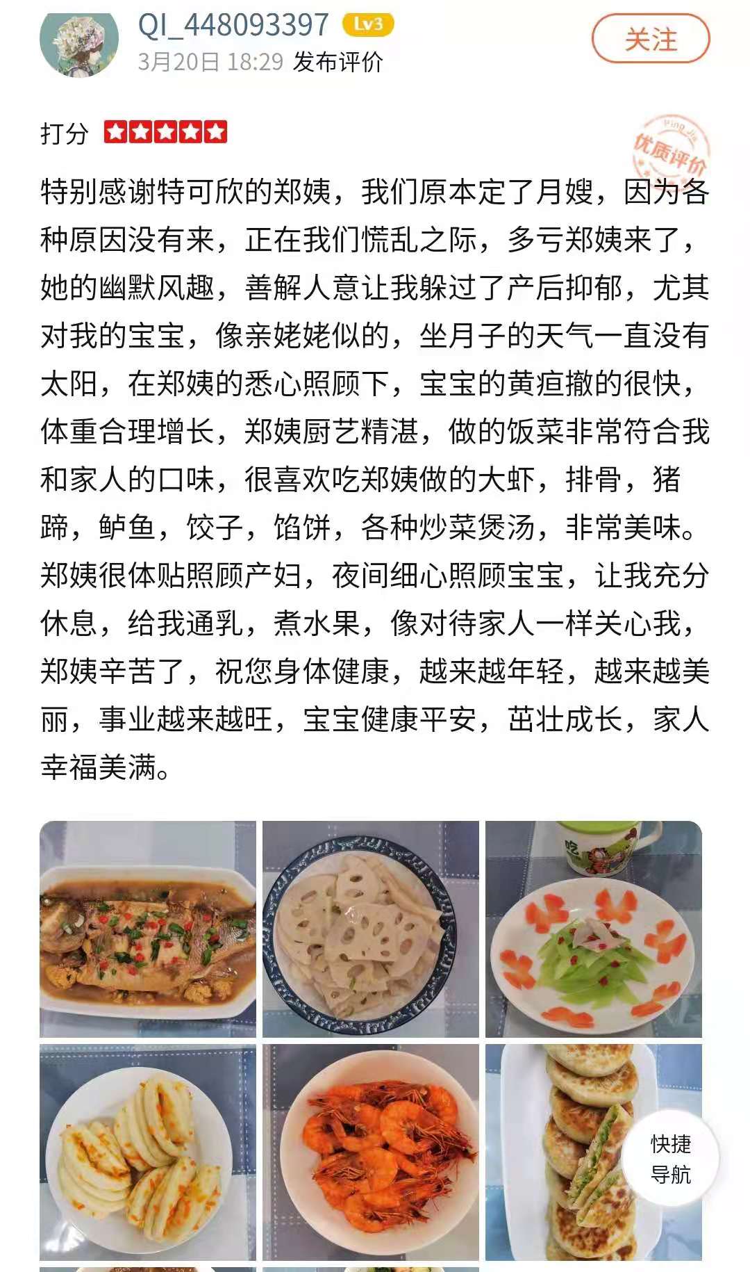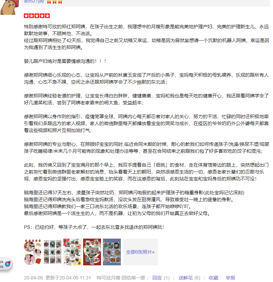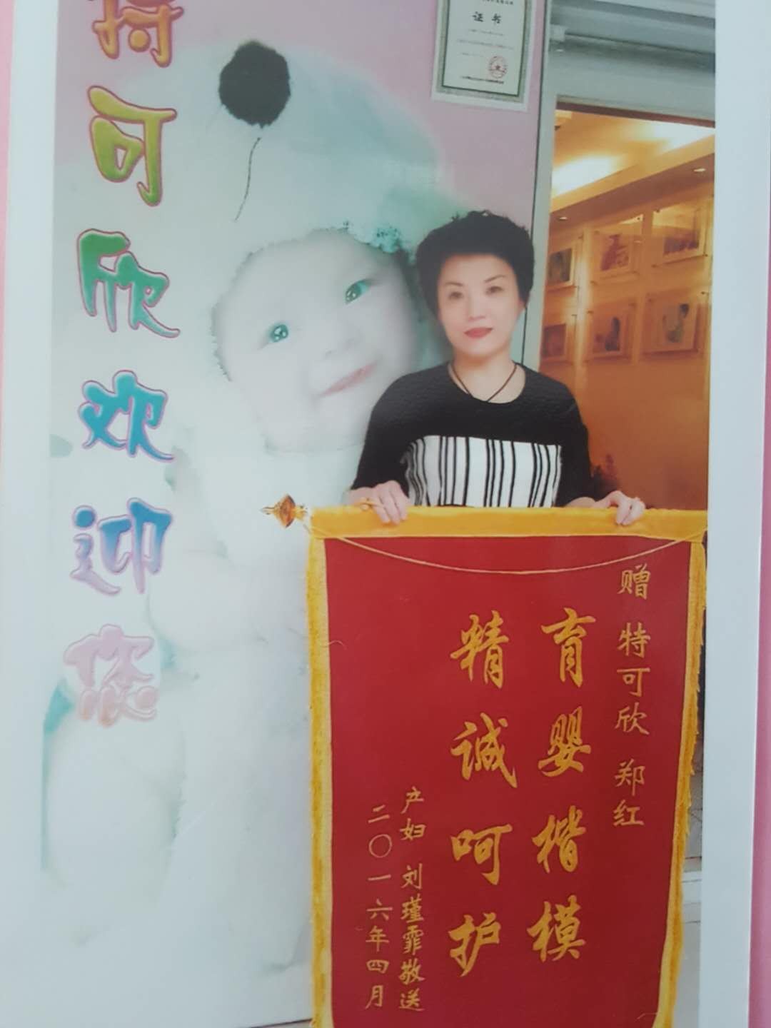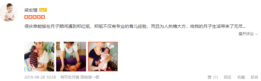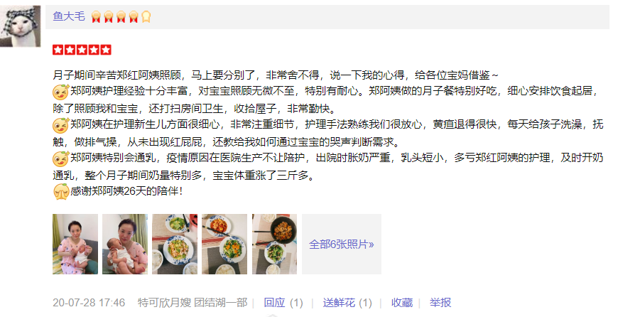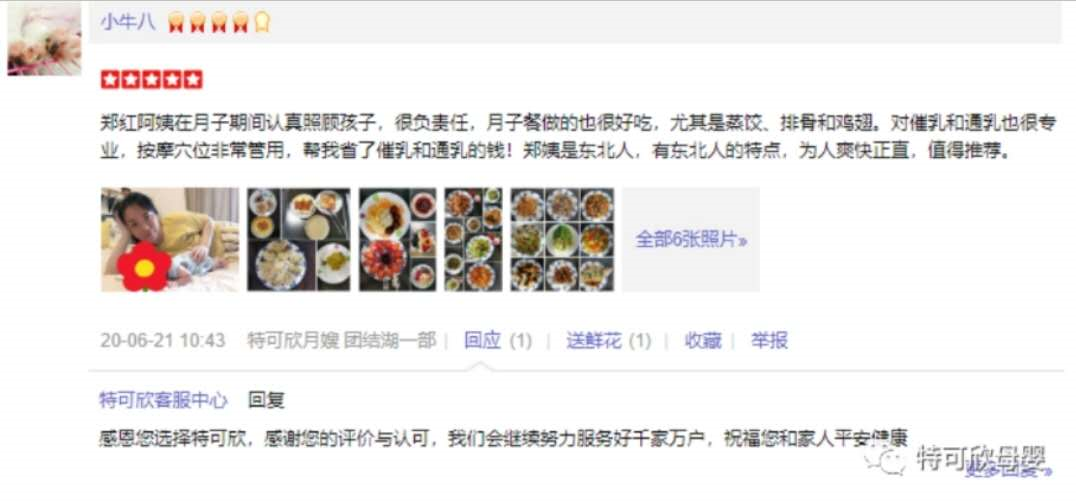 2010年从业特可欣,做事勤快、厨艺好。性格开朗,喜欢孩子,好沟通。擅长产妇及婴儿护理。产妇护理技能:剖腹产及侧切伤口护理,心理疏导,催乳,子宫复旧等;婴儿护理技能:洗澡,抚触,被动操,排气操,婴儿常见疾病观察及预防指导等。