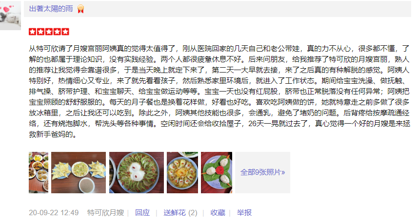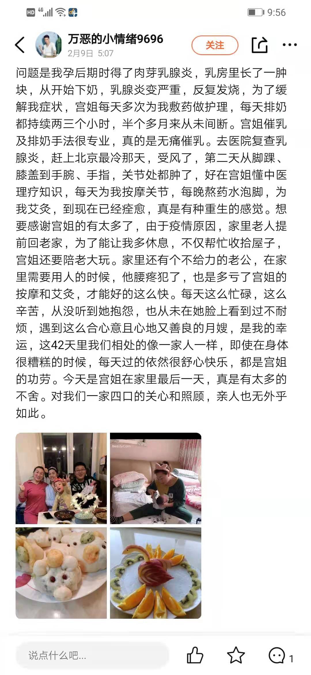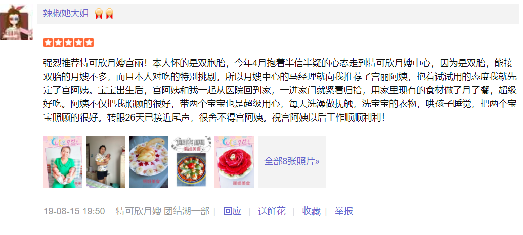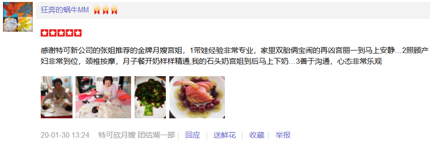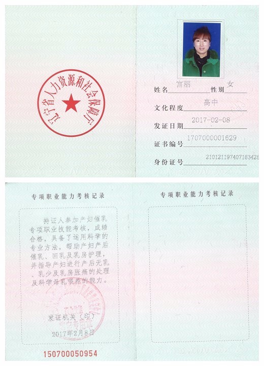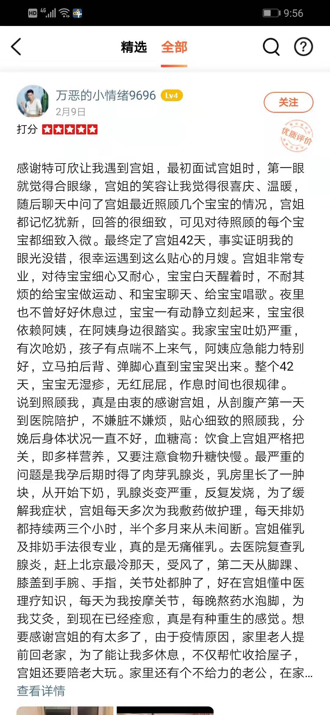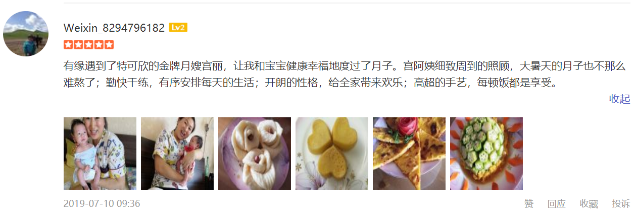 2010年从业特可欣,热情大方,勤劳肯干,擅长带双胎,产妇及婴儿护理。产妇护理技能:催乳,子宫复旧,产褥期科学指导,月子餐营养搭配等,心理健康指导等。婴儿护理技能:洗澡,抚触,被动操,排气操,脐带护理,黄疸观察,鹅口疮,泪囊阻塞等。月嫂座右铭:让您的月子温馨快乐