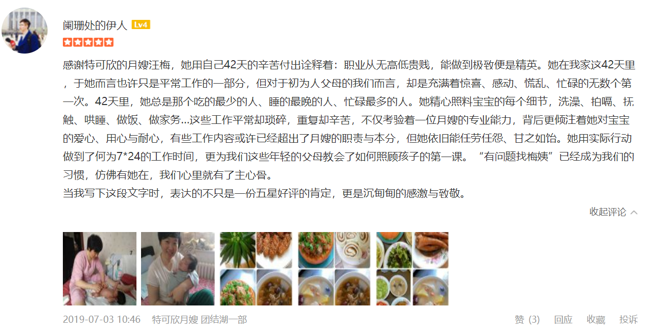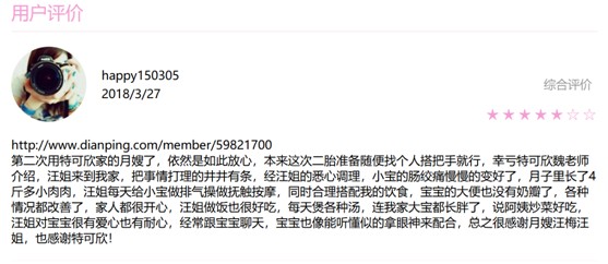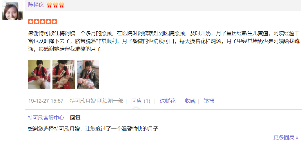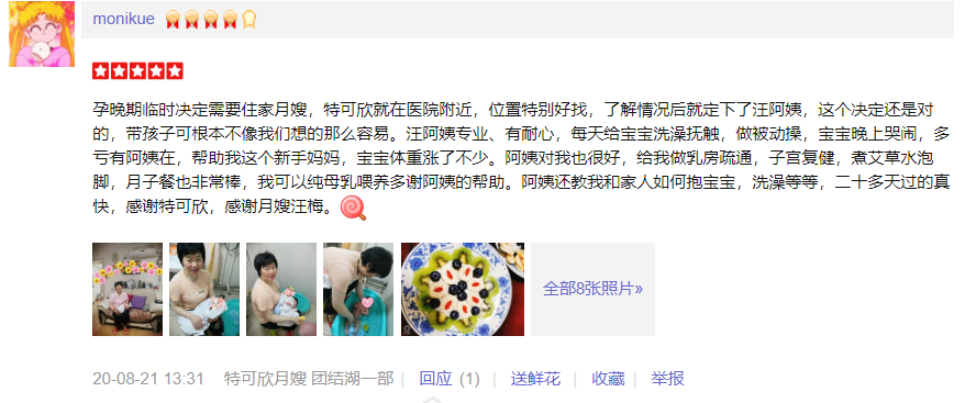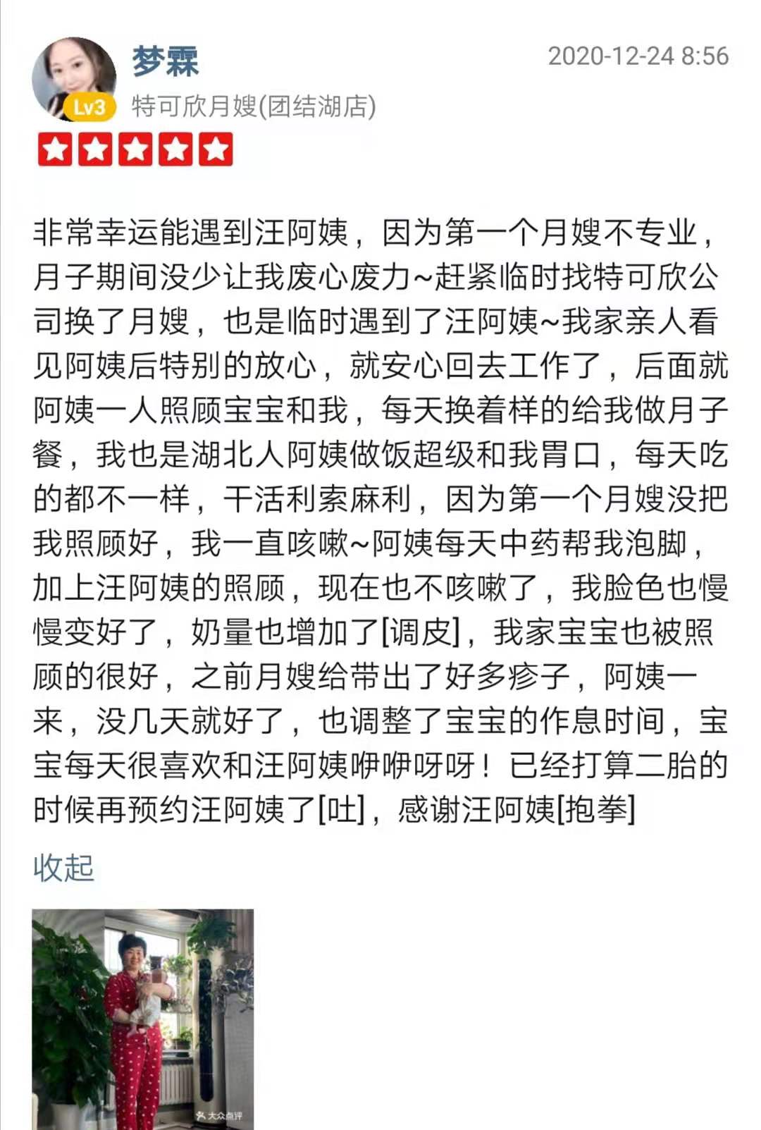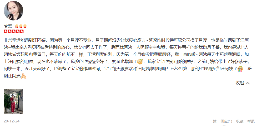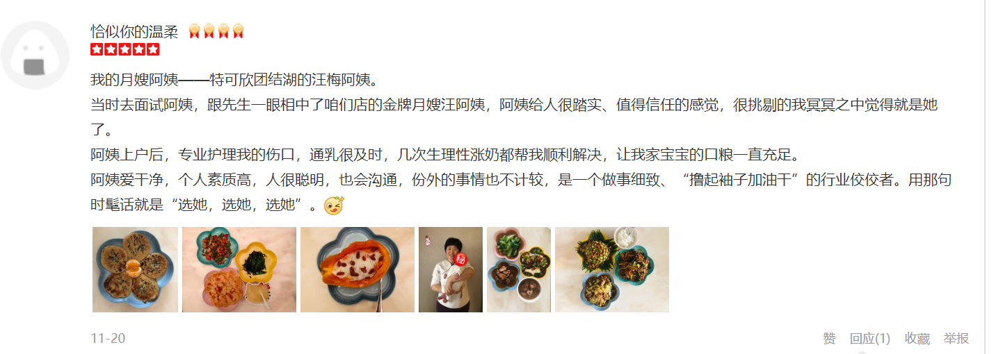 2009年从业特可欣,从事月嫂工作经验丰富,工作认真,性格开朗,温柔体贴,擅长婴儿护理,婴儿早期智力开发,婴儿常见疾病的观察及预防。实际操作:婴儿被动操,抚触,婴儿排气操;擅长产妇护理,催乳,科学指导产褥汗,并针对性穴位按摩,产后形体恢复等;擅长月子餐制作,根据产妇的体质进行月子餐配制;