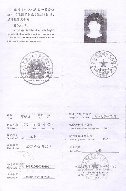 2007年至今从事月嫂工作,为人善良,做事认真。产妇护理技能:乳房护理,月子餐制作,产褥期科学指导等,婴儿护理技能:洗澡,抚触,被动操,排气操,常见病观察与指导等;