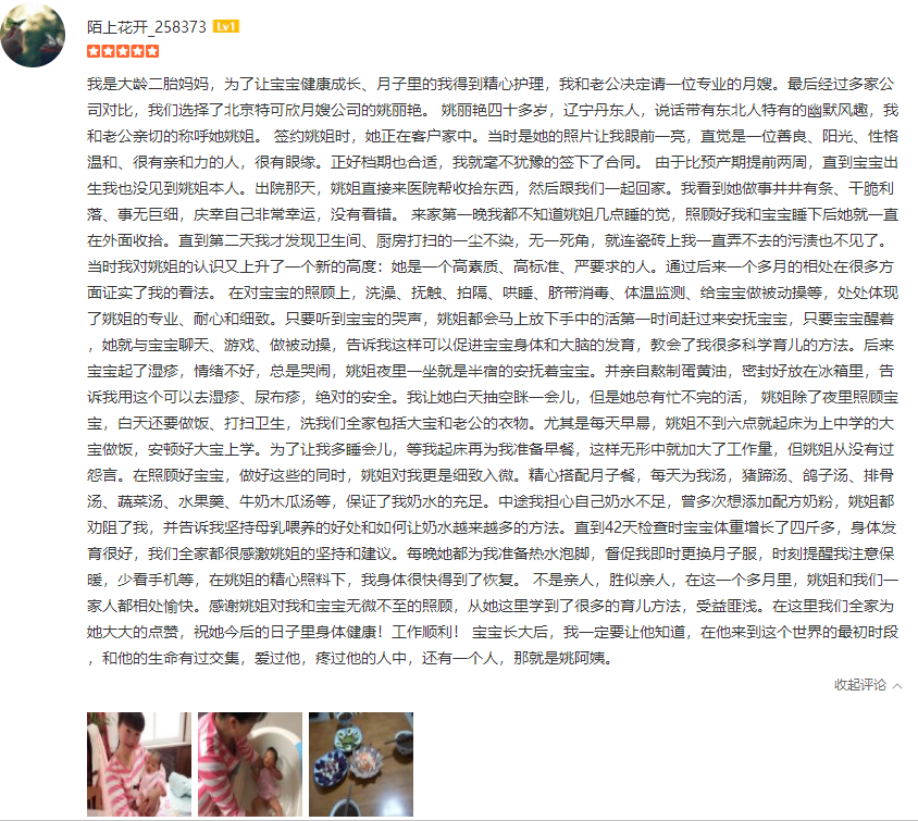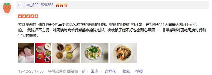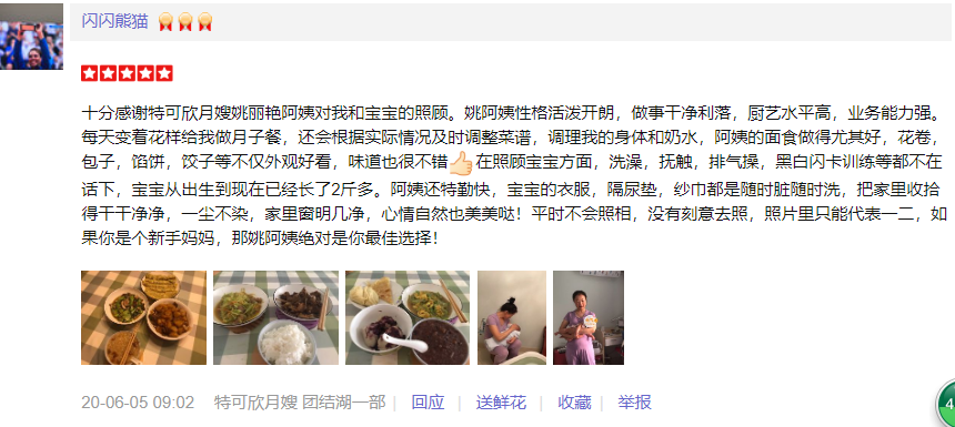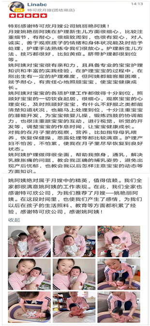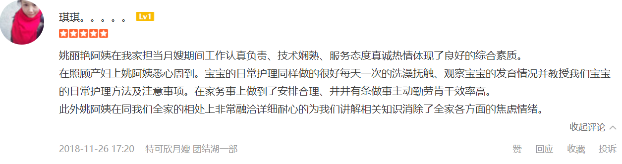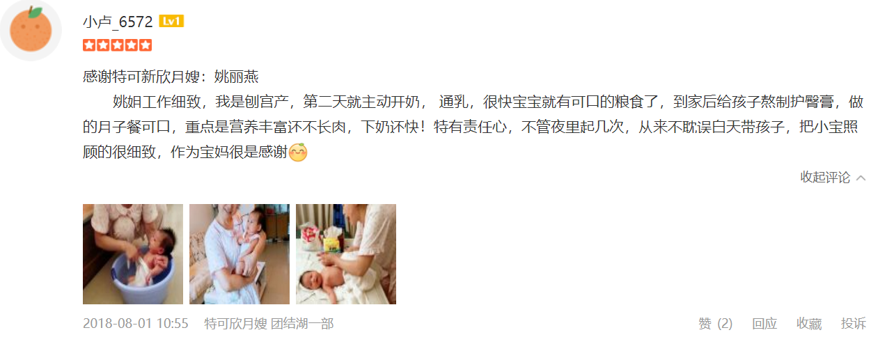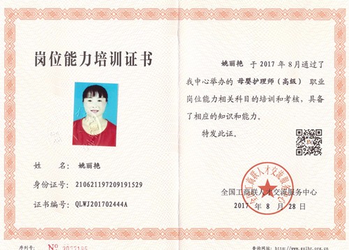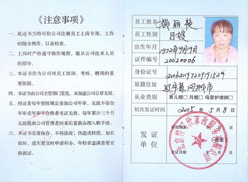 2009年起从事月嫂工作,做事勤快、吃苦耐劳,温柔可亲,干净利落,对产妇的身体恢复和宝宝常见病的观察和处理护理专业。月子餐科学合理,沟通能力好。 技能实操:剖腹产及顺长侧切伤口的护理、新生儿抚触、被动操、排气操等。