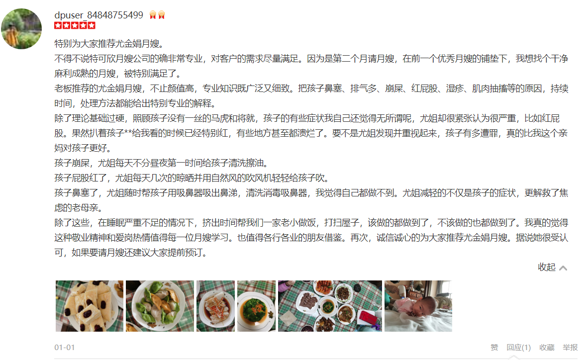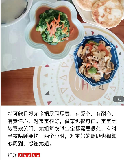 感谢北京特可欣月嫂公司,通过熟人介绍,我认识了月嫂尤金娟尤姐,尤姐人很实在,护理宝宝和我更是专业和细心,尤姐做了一手的好菜,营养搭配合理,保证了我和宝宝的营养还能保持身材。42天的相处时光马上要结束了,真的很舍不得,希望尤姐今后的日子工作顺利,越来越漂亮18-10-11 13:26