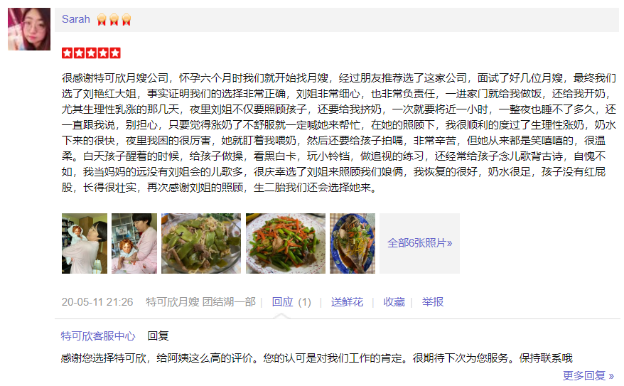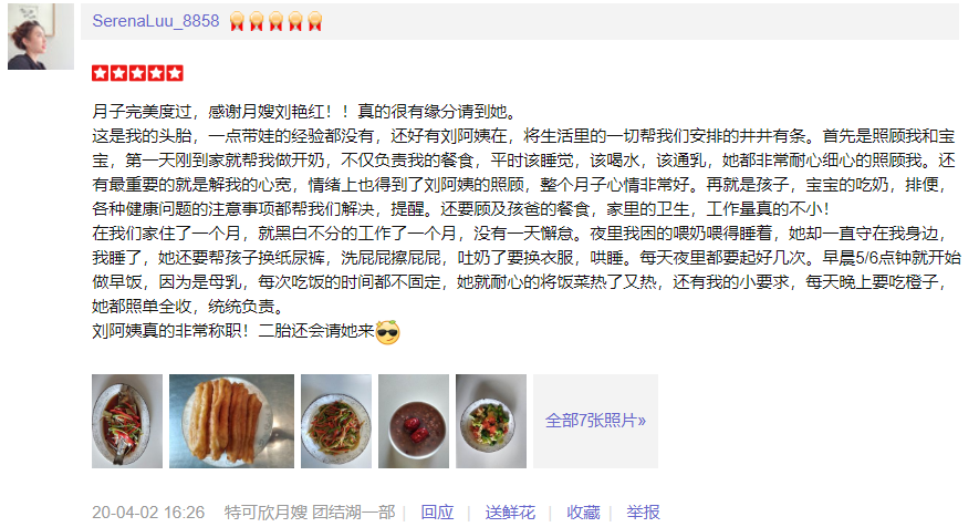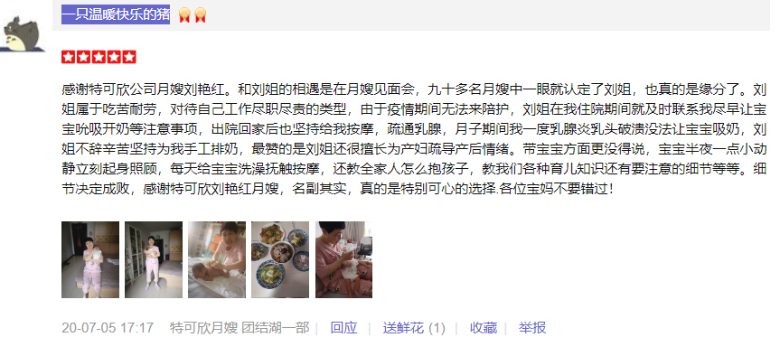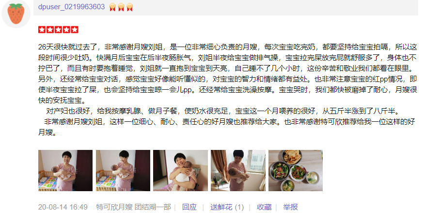 2013年从业特可欣,工作细致,性格随和,为人朴实,好沟通,有责任心。产妇护理技能:月子餐制作,乳房常规护理,产褥期护理等;婴儿护理技能:洗澡,抚触,被动操,排气操,早教,黄疸观察,脐带消炎,湿疹,臀红,肠胀气,幽门痉挛的预防及护理等。