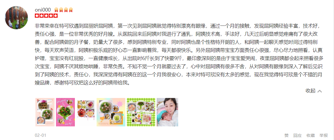 2012年从业特可欣,幼师毕业。喜欢孩子,有爱心,沟通能力好。多年从事幼儿教育,了解儿童心理发展,开发宝宝认知能力。擅长产妇及新生儿,早产儿,双胞胎护理。产妇护理技能:心理疏导,乳房护理,月子餐营养搭配,产褥期科学指导,恶露的观察等。婴儿护理技能:新生儿早教开发,洗澡,抚触,被动操,排气操,常见病的观察及预防指导,如:湿疹,臀红,尿布疹,脐带消毒,黄疸观察等;月嫂座右铭:因为喜欢所以我会全心全意的投入