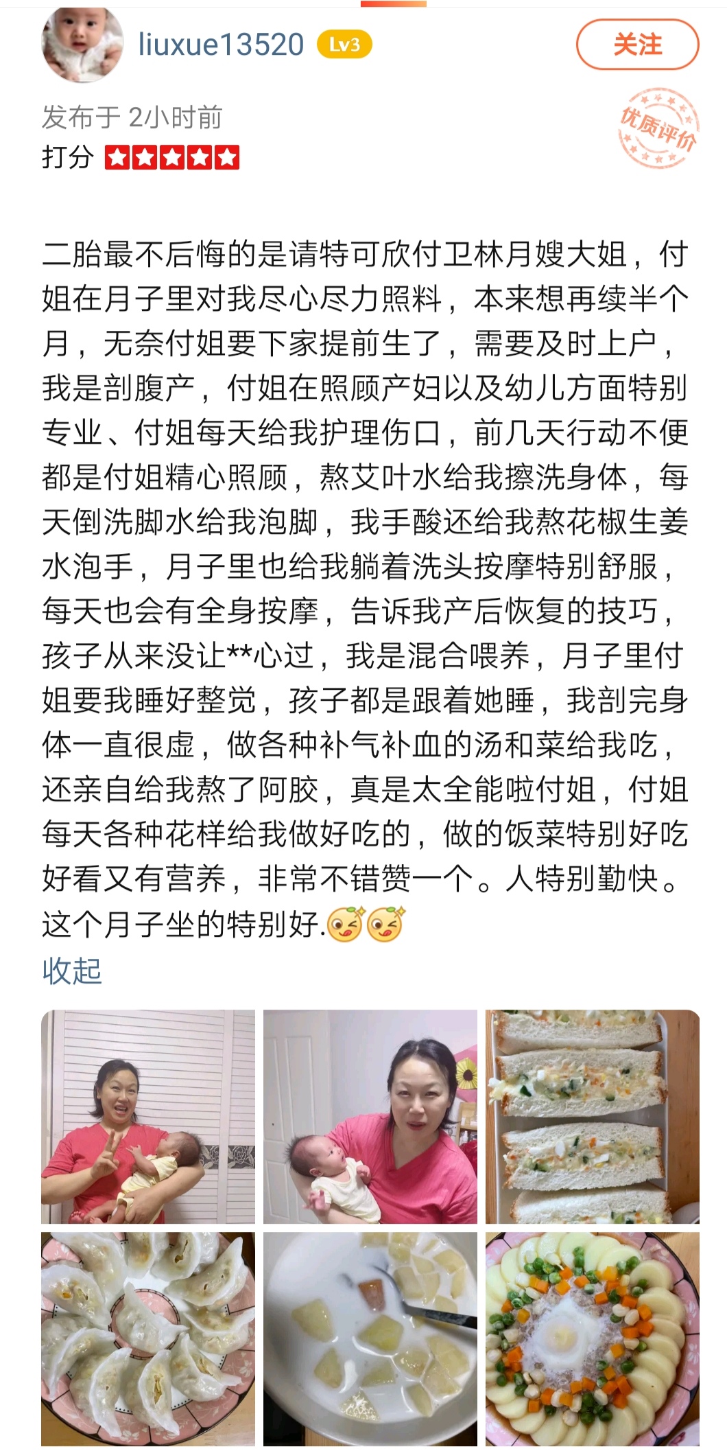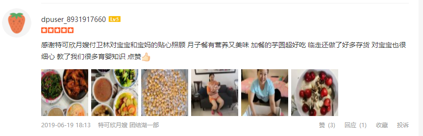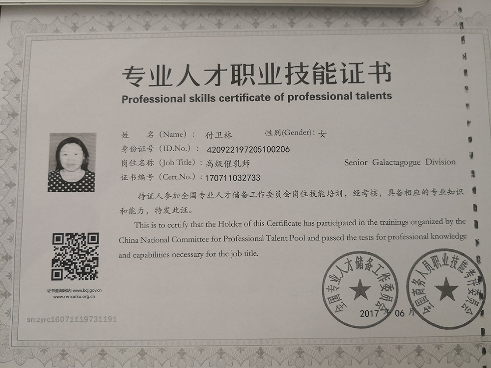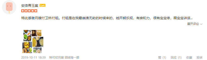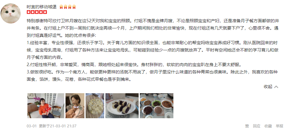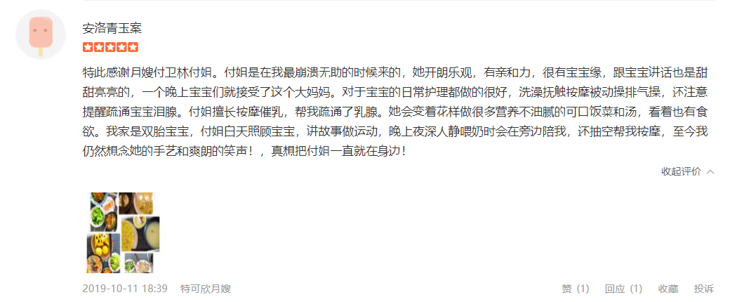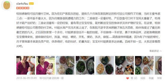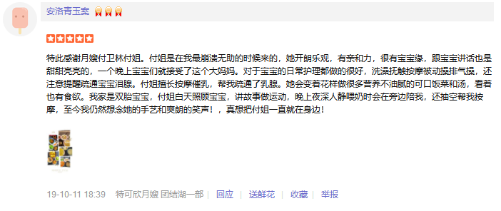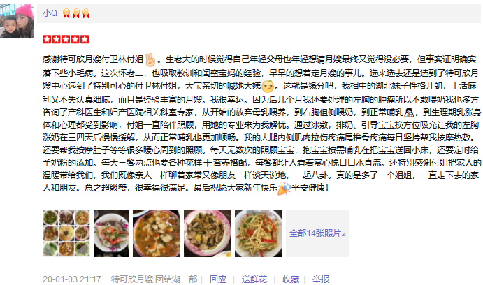 2010年从业特可欣,性格温顺善良。产妇护理技能:乳房护理,通乳,月子营养餐配制,子宫复旧,产褥期科学指导,恶露观察,形体恢复等。婴儿护理技能:洗澡,游泳,婴儿早教,被动操,排气操,抚触,黄疸观察,脐带消毒,湿疹,臀红,鹅口疮等常见病的观察及预防等。