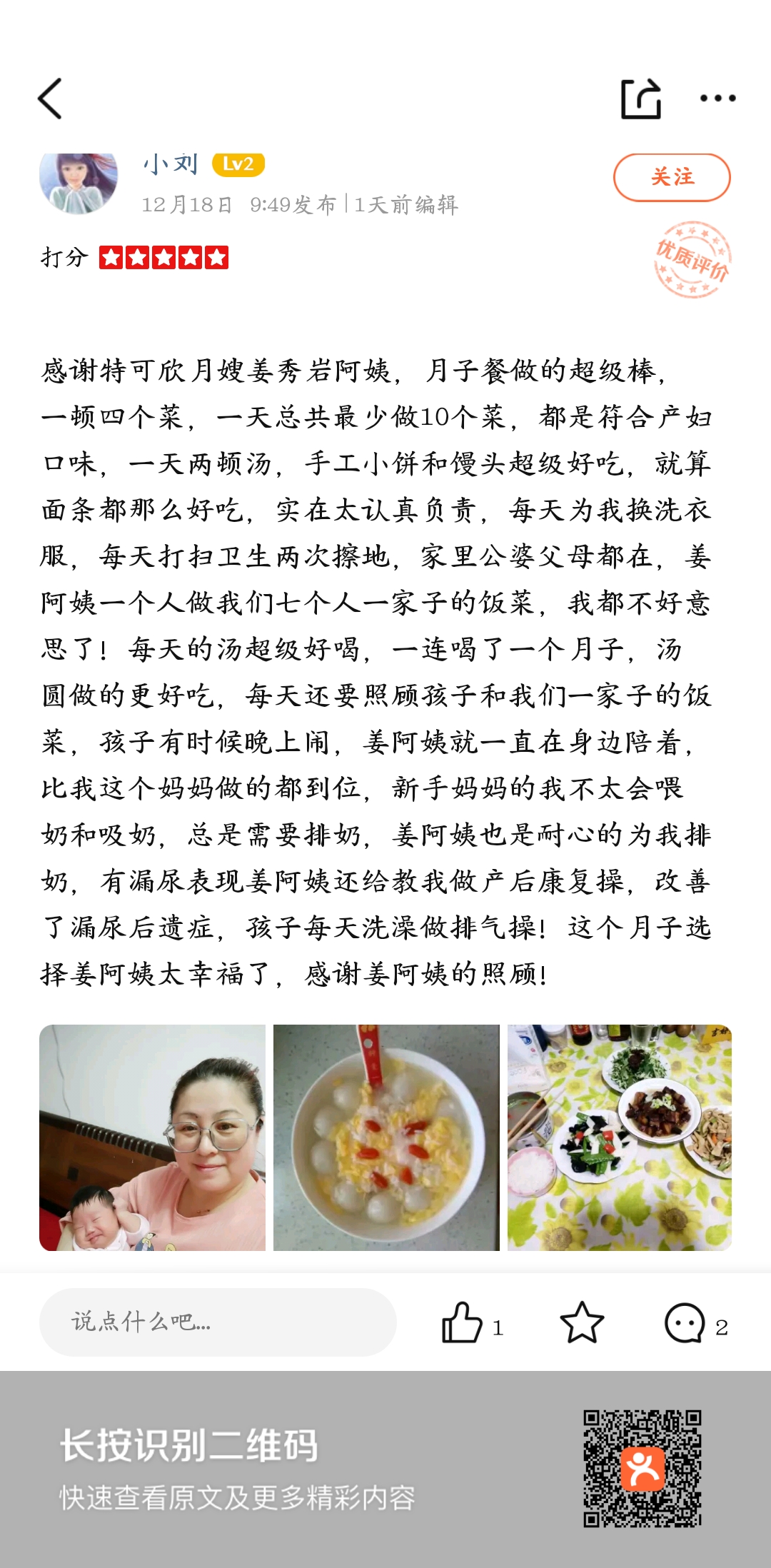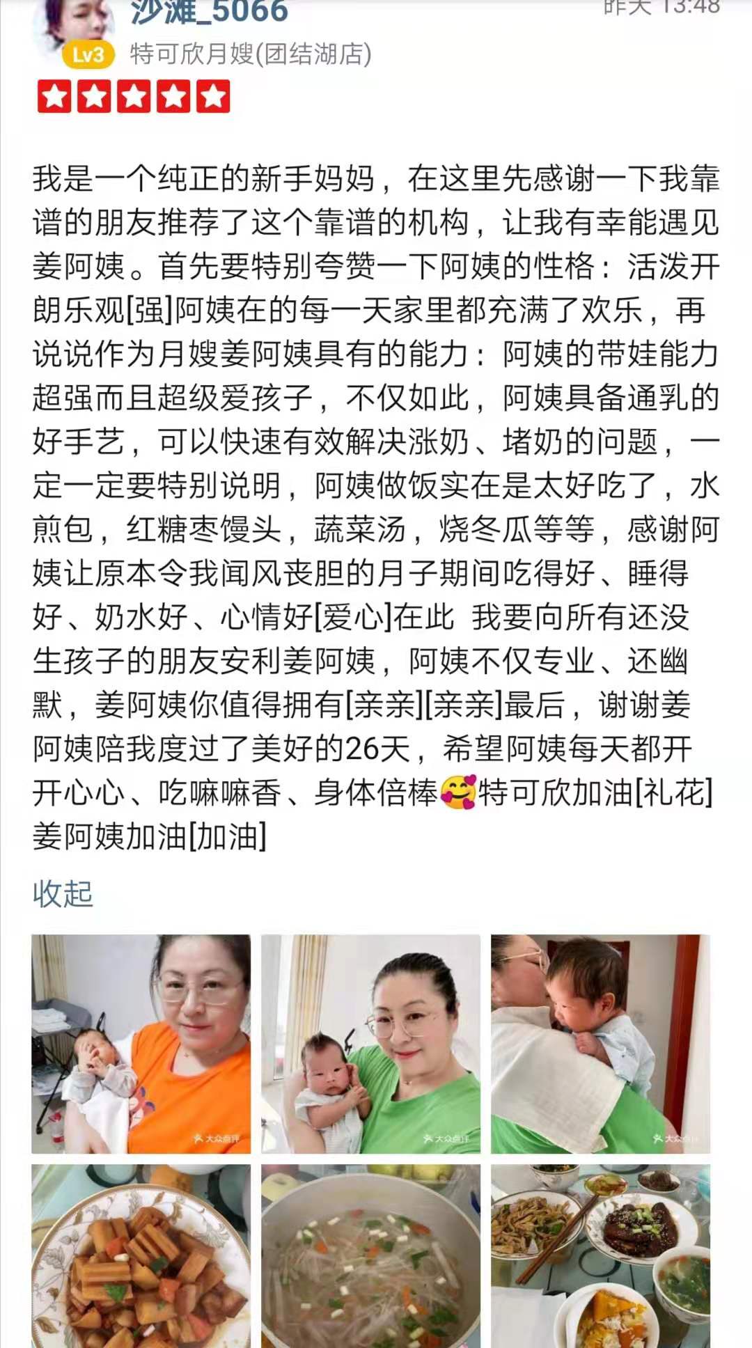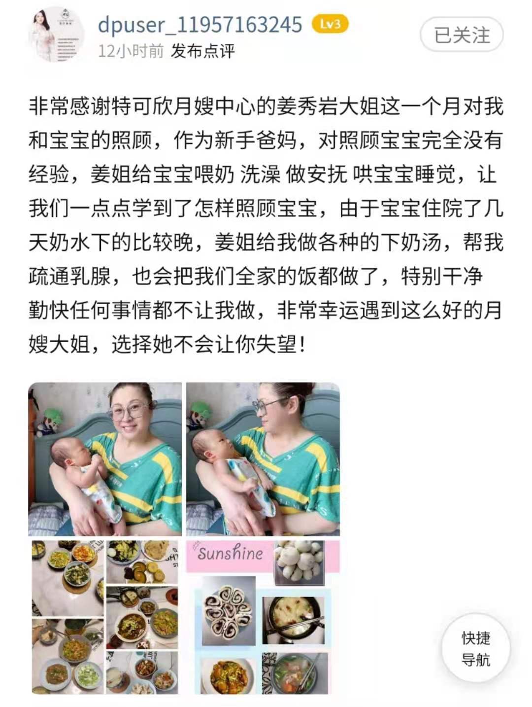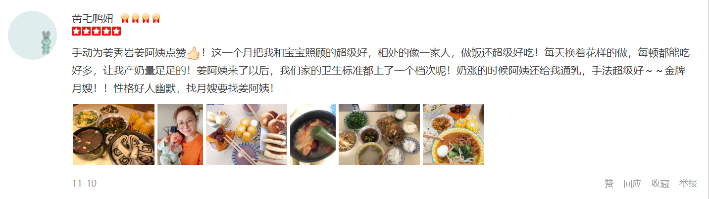 特可欣姜秀岩2008年入职,工作期间能为客户着想能吃苦,又干净又勤劳,性格直爽,工作细心,认真,职业素养高。 厨艺好,每天根据产妇的身体需要,合理搭配很多样客户爱吃的饭菜。 擅长:按摩催乳,会调理奶量少。最主要的是姜姐是发自内心的喜欢孩子,让每一位客户放心的把孩子交给她照顾,宝妈们试试就知道了。