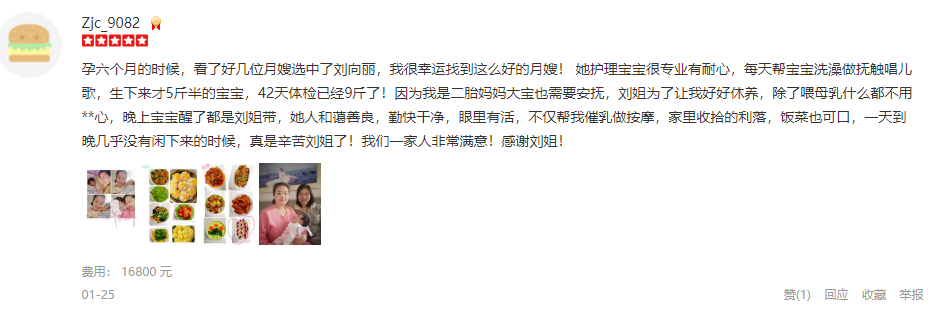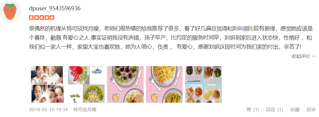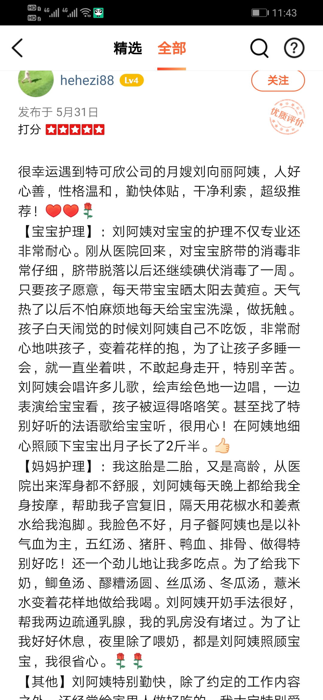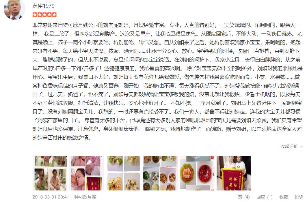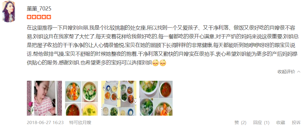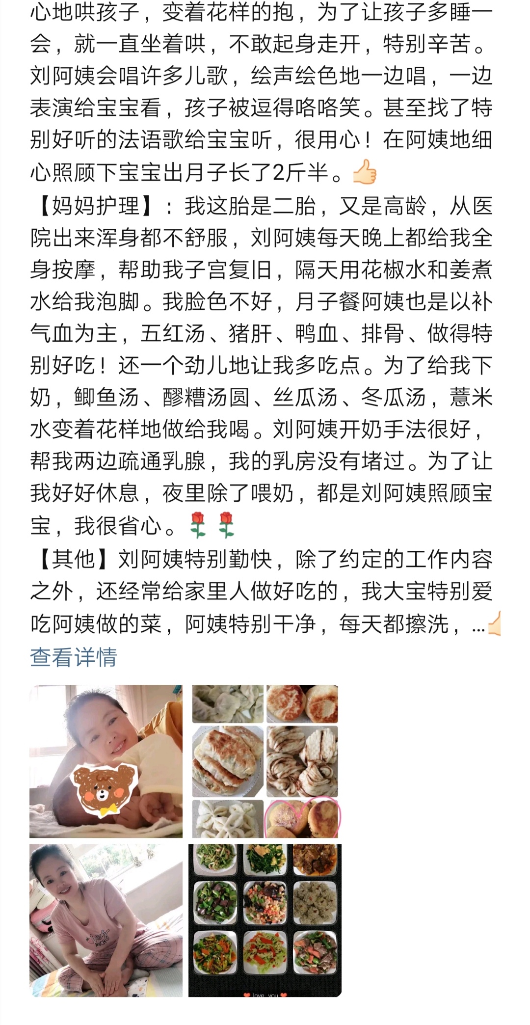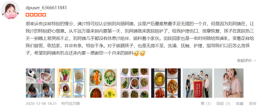 2014年从业特可欣,工作认真负责,干净利落,沟通能力好。产妇护理技能:乳房护理,月子餐制作,产褥期科学指导,剖腹产,顺产侧切伤口的护理,子宫复旧等。婴儿护理技能:洗澡,抚触,被动操,排气操,黄疸观察,脐带消毒,湿疹,臀红,尿布疹等新生儿常见疾病的观察及预防指导等。
