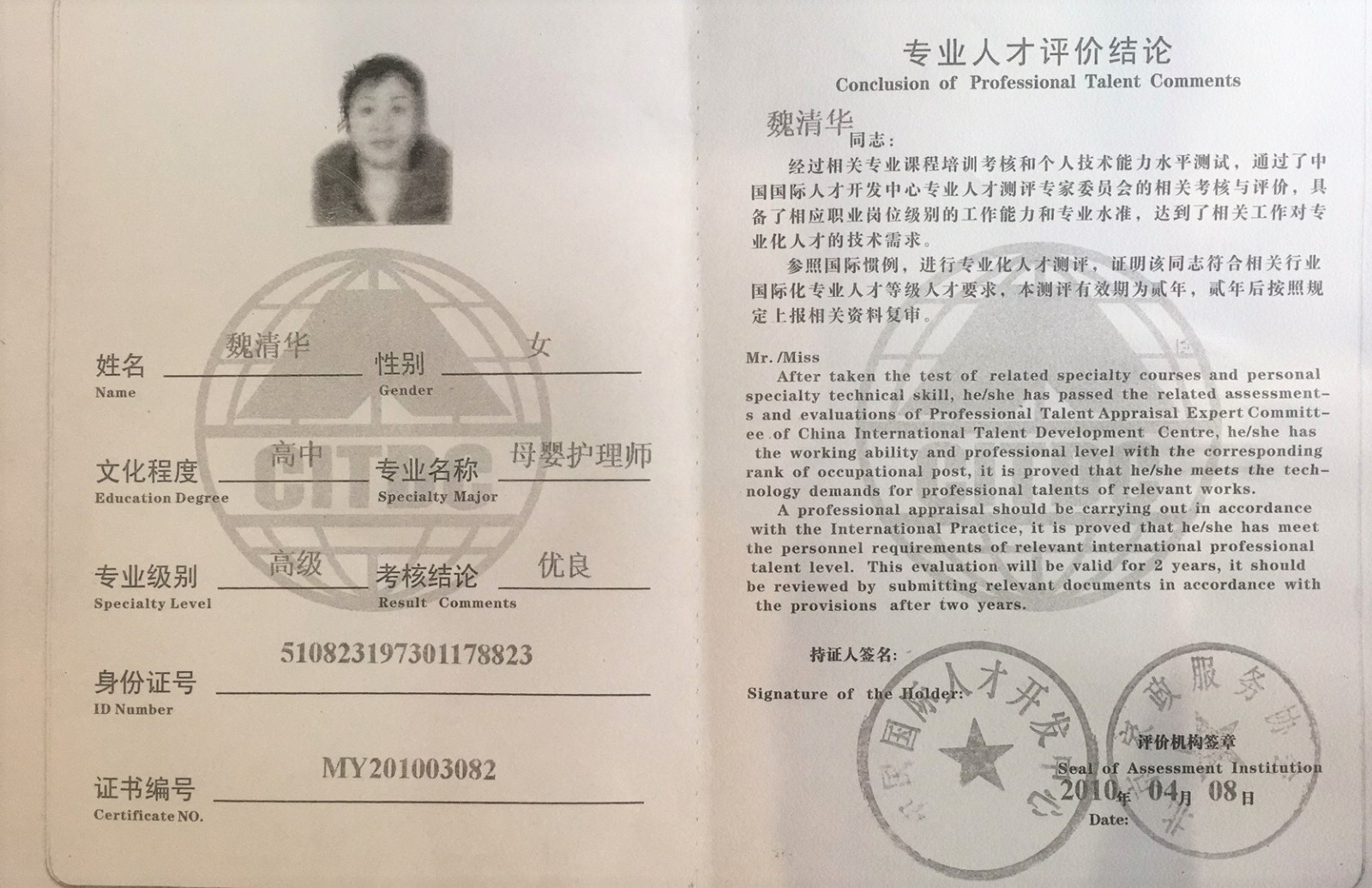 2006年从业特可欣,喜欢孩子,有爱心,性格开朗,善于沟通。产妇护理技能:乳房护理,月子餐制作,产褥期科学指导,剖腹产,顺产侧切伤口的护理,子宫复旧等。婴儿护理技能:洗澡,抚触,被动操,排气操,黄疸观察,脐带消毒,湿疹,臀红,尿布疹等新生儿常见疾病的观察及预防指导等。