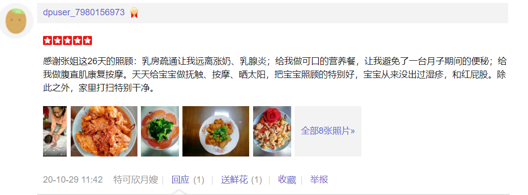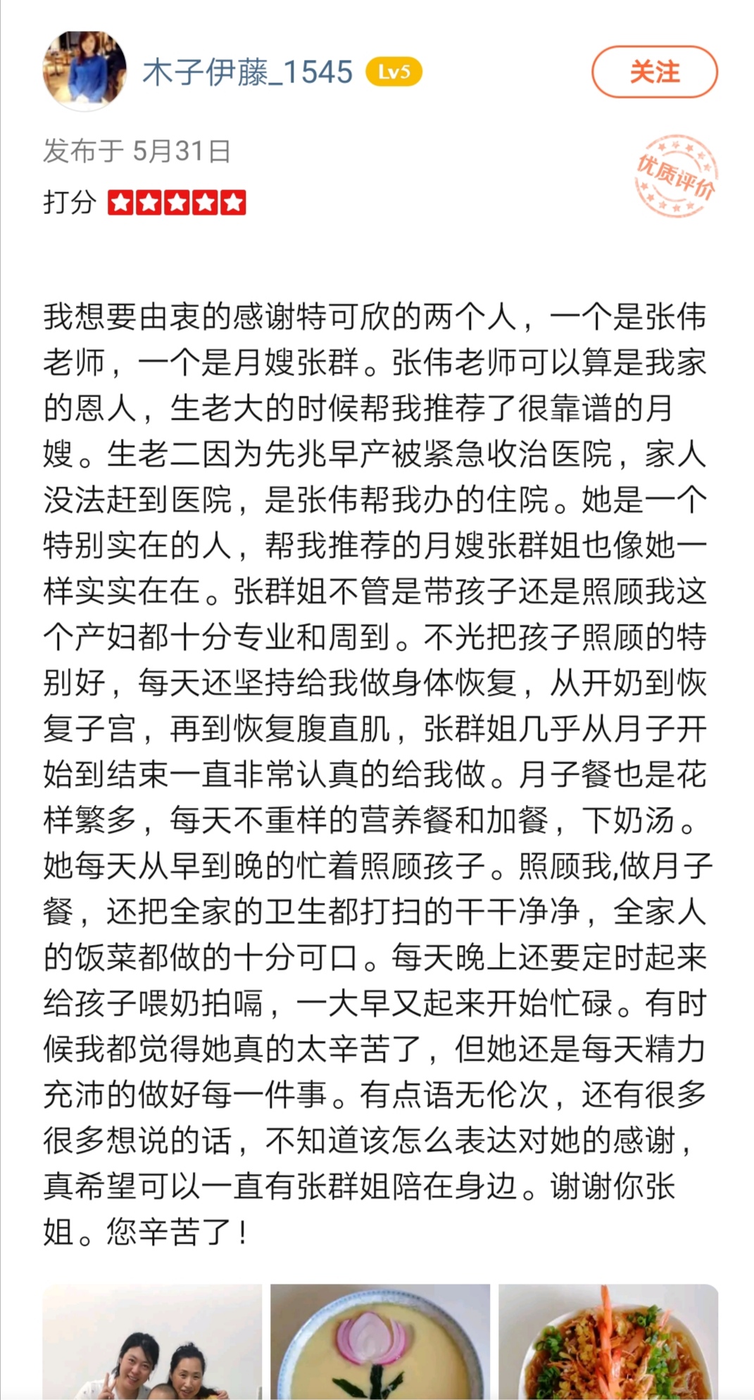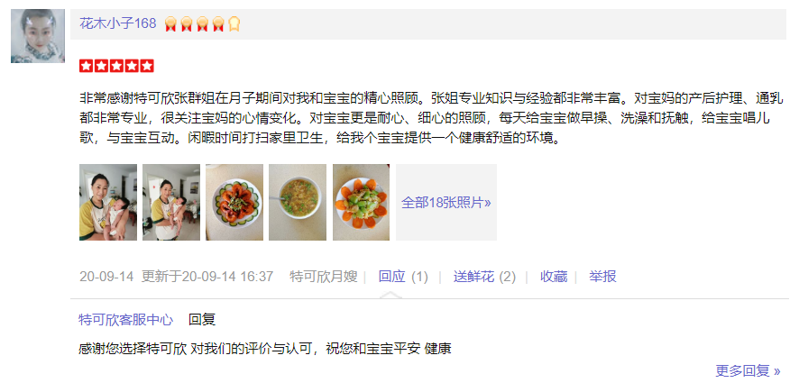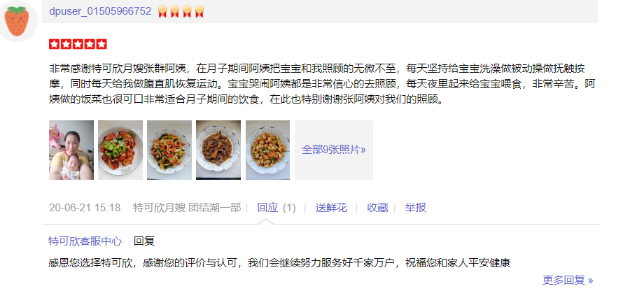 2014年从业特可欣,性格开朗好沟通。擅长催乳,煲汤,产妇及婴儿护理,产妇护理技能:营养餐合理配制,子宫复旧,产褥期的科学指导,如:早产儿护理,产褥汗的护理,恶露的观察等。婴儿护理技能:早教,被动操,排气操,抚触,洗澡,常见疾病的观察及指导,如:脐带消毒,黄疸观察,湿疹的预防与护理,臀红的预防与护理等。