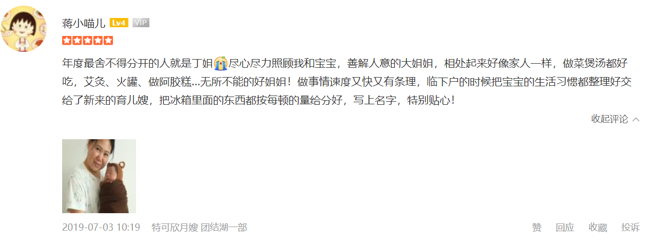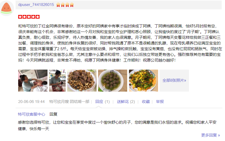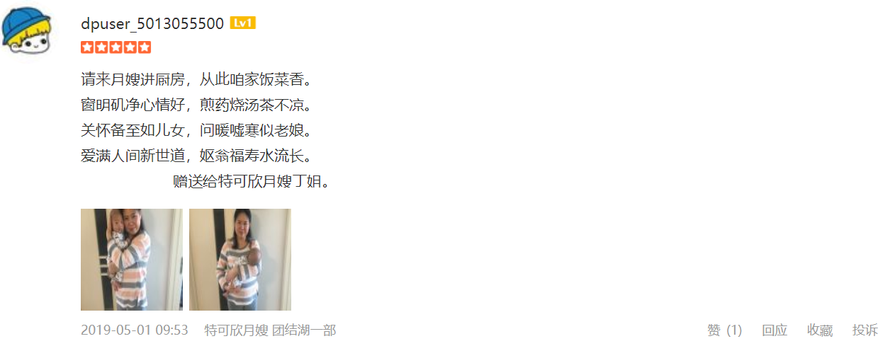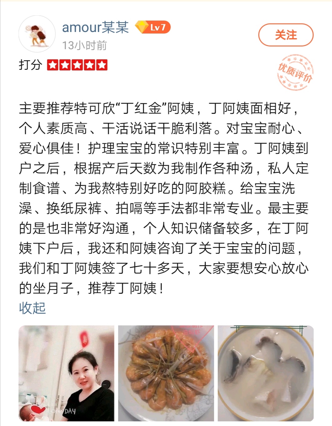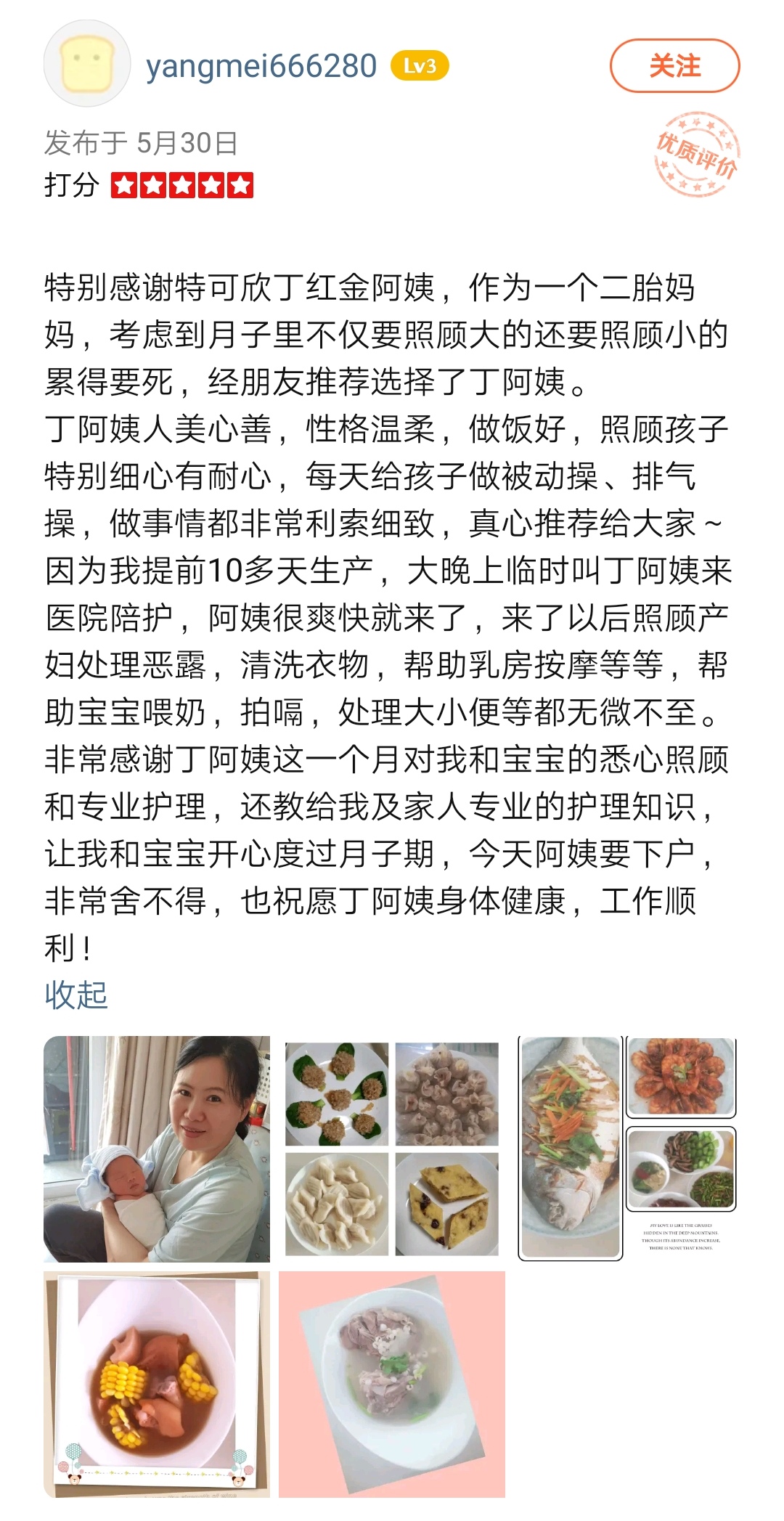2012年加入特可欣做月嫂 ,其中包括十几个早产儿,护理过的新生儿都很健康,善于不断总结经验,给宝妈传授经验,育儿理念新颖易懂,紧跟时代。擅长产妇及婴儿护理; 产妇护理技能:催乳,身体按摩排毒,月子餐制作,产褥期科学指导,心理健康指导等。 婴儿护理技能:洗澡,抚触,被动操,脐部护理,黄疸观察,湿疹臀红的预防指导,婴儿早教等