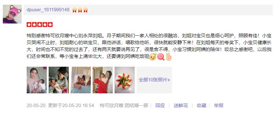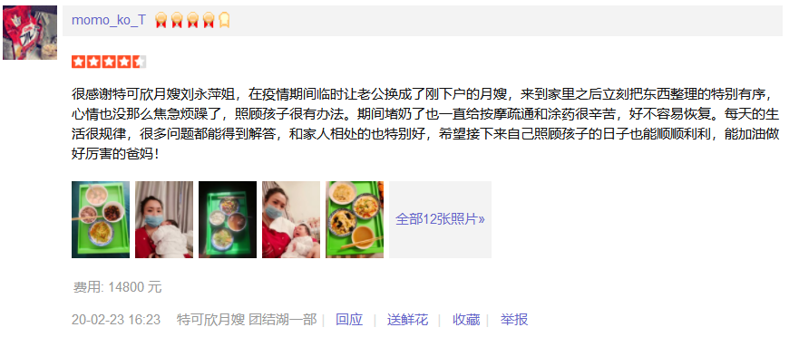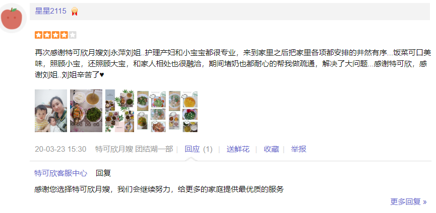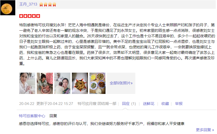 2015年从业特可欣,性格稳重踏实,细心,有爱心责任心,擅长产妇及婴儿护理。 产妇护理技能:催乳,月子餐 产后形体恢复,产褥汗科学指导,恶露观察,子宫复旧等; 婴儿护理:洗澡、抚触、被动操、排气操、脐部消毒等 观察新生儿常见疾病,如:红臀,湿疹、幽门痉挛、肠痉挛、鹅口疮、黄疸,大小便观察,啼哭观察等
