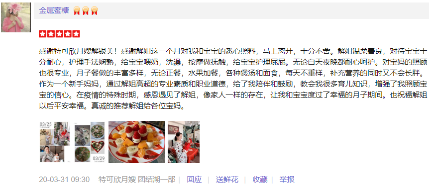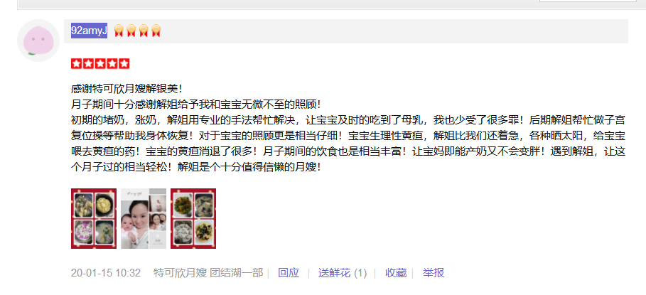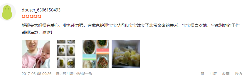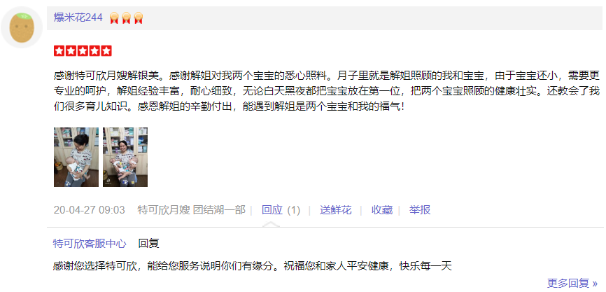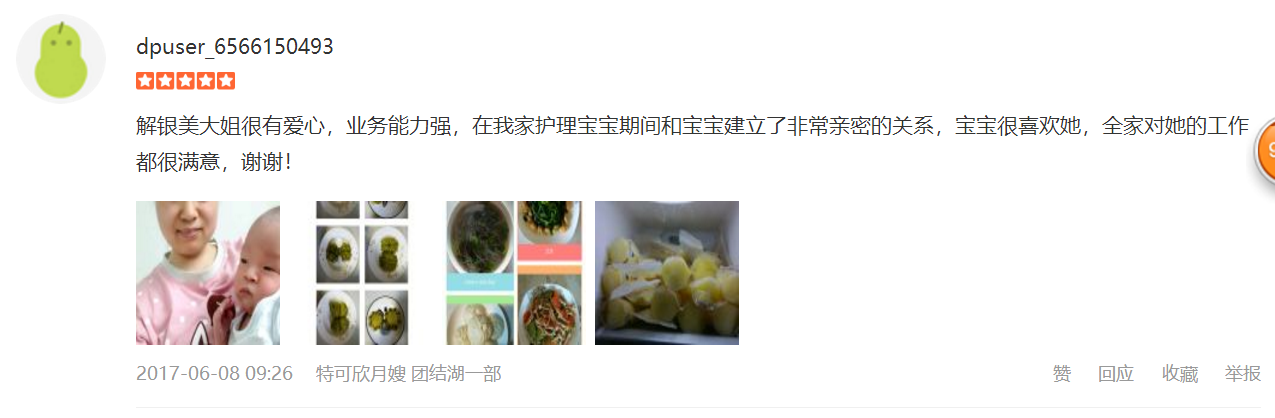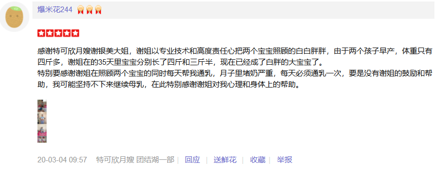 2010年从业特可欣,原籍山东,嫁入黑龙江,性格温顺,有爱心。擅长产妇及婴儿护理;产妇护理技能:催乳,月子餐合理搭配,子宫复旧,按摩,形体恢复;产褥期的科学护理与指导等。婴儿护理技能:洗澡,游泳,抚触,被动操,排气操,常见疾病的观察与预防指导等(如:黄疸,脐带,鹅口疮,尿布疹等)月嫂座右铭:做最好的自己,服务好每一位新妈妈,照顾好每一位小天使。