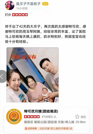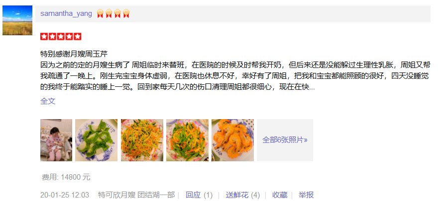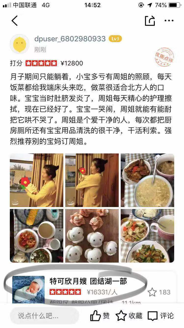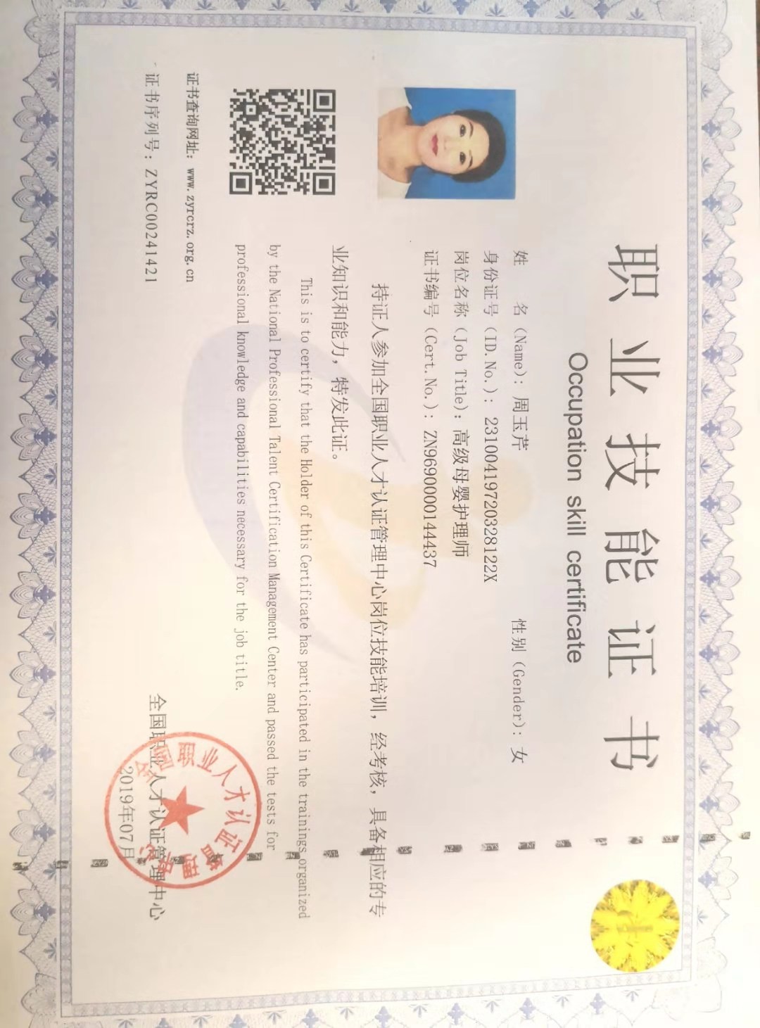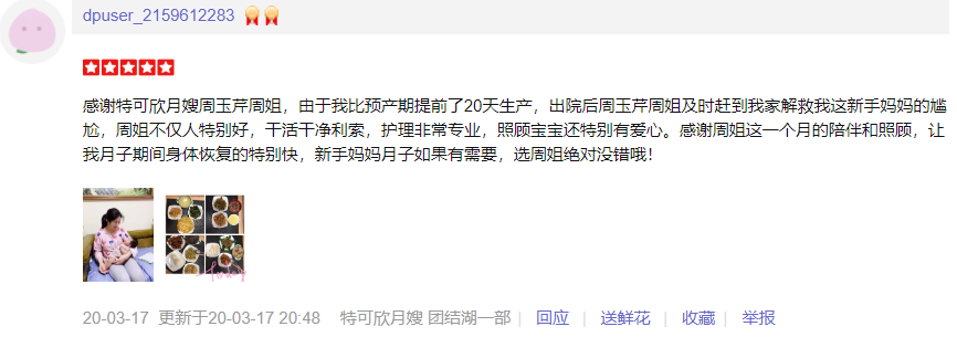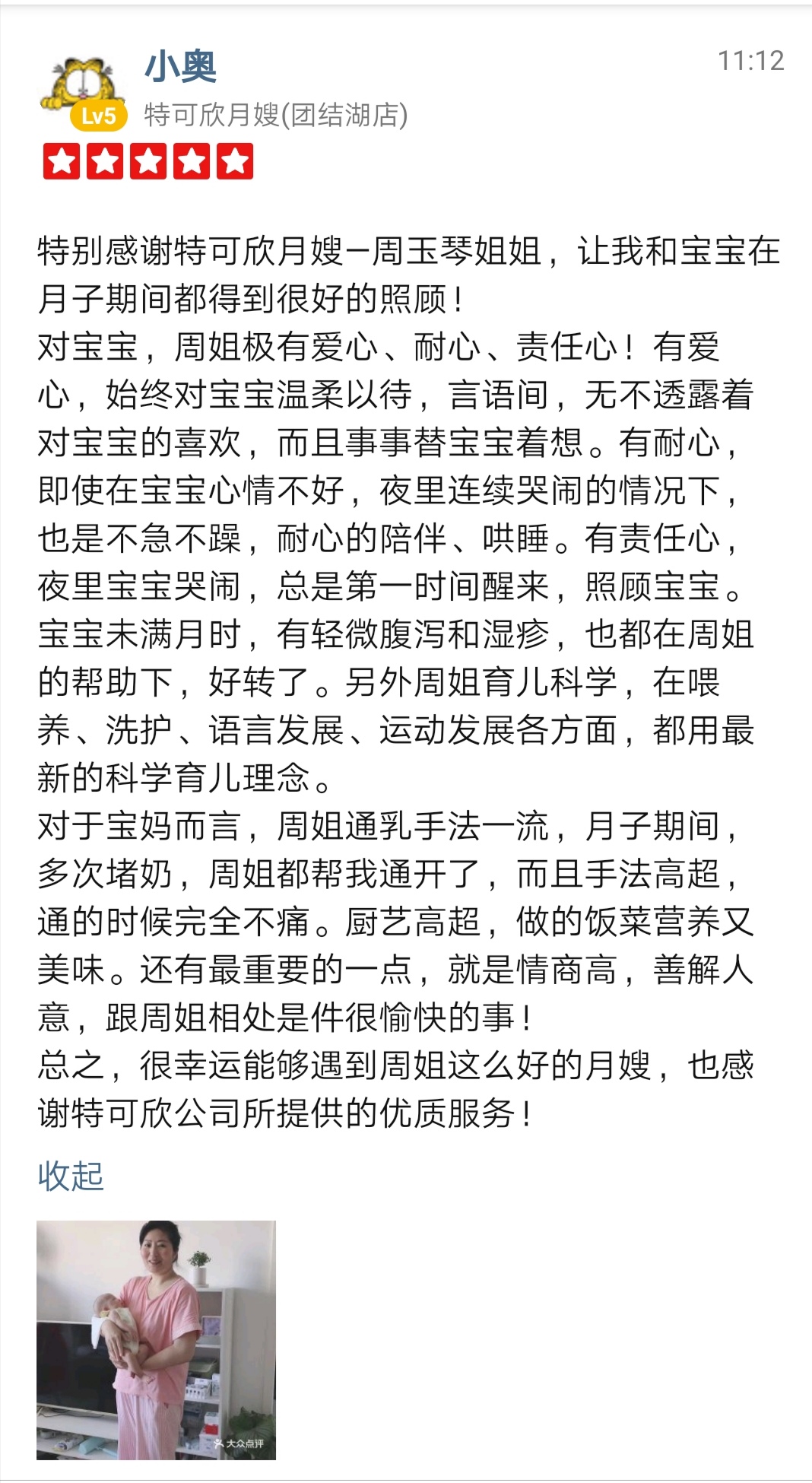 2014年起从事特可欣,热爱本职工作,勤劳善良,干净利落,沟通好。擅长月子餐制作,厨艺好。产妇几婴儿护理专业。产妇护理:子宫复旧,乳房护理,恶露观察,产褥汗科学指导; 婴儿护理:洗澡,游泳;黄疸观察,脐部护理,湿疹;臀红;尿布疹;等观察及预防;抚触,被动操;排气操等实际操作。月嫂座右铭:服务好每一位客户
