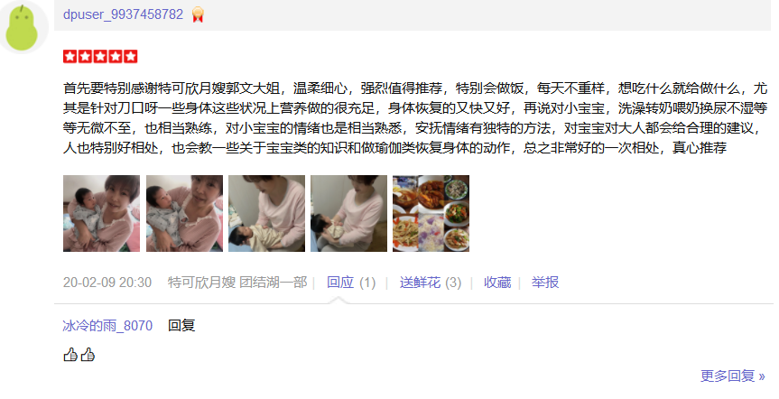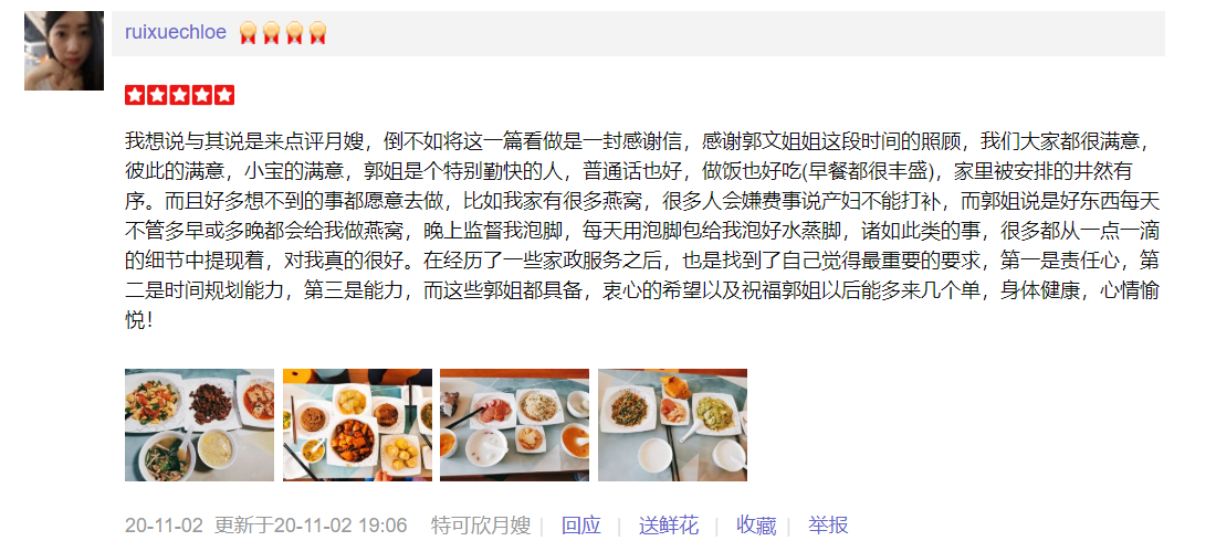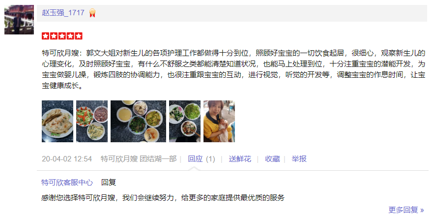 2016加入特可欣,工作期间能为客户着想能吃苦,干净勤劳,性格温和,工作细心,认真,职业素养高。 厨艺好,每天根据产妇的身体需要,合理搭配多样化。 擅长:月子餐 产妇技能:乳房护理,恶露观察,产褥汗的科学指导,子宫复旧,产妇如常生活护理等; 婴儿护理:洗澡、抚触、被动操、排气操、新生儿常见疾病的观察及护理等;如:臀红、脐部消毒、尿布疹、湿疹、鹅口疮等;