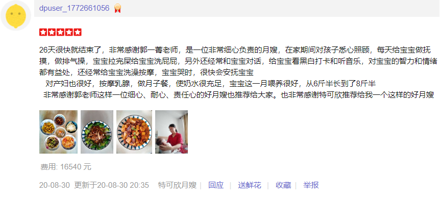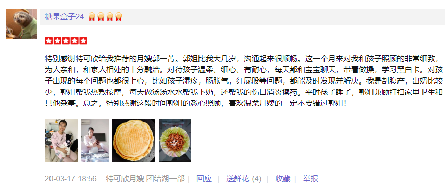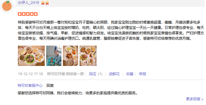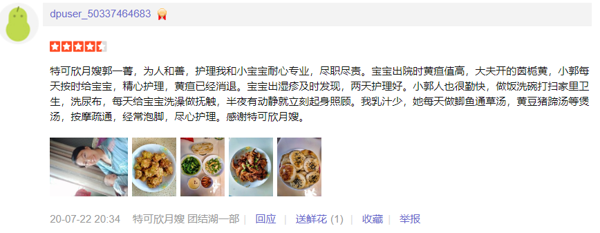 2016从事月嫂,性格开朗,工作认真负责,干净利落,沟通能力好。擅长煲汤、面食、产妇婴儿护理 产妇护理技能:乳房护理,月子餐制作,产褥期科学指导,剖腹产,顺产侧切伤口的护理,子宫复旧等。 婴儿护理技能:洗澡,抚触,被动操,排气操,黄疸观察,脐带消毒,湿疹,臀红,尿布疹等新生儿常见疾病的观察及预防指导等。