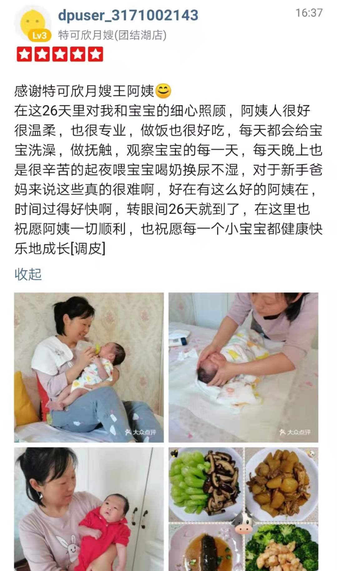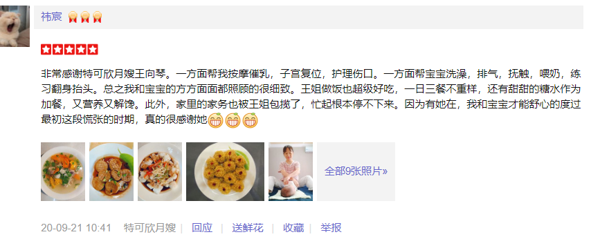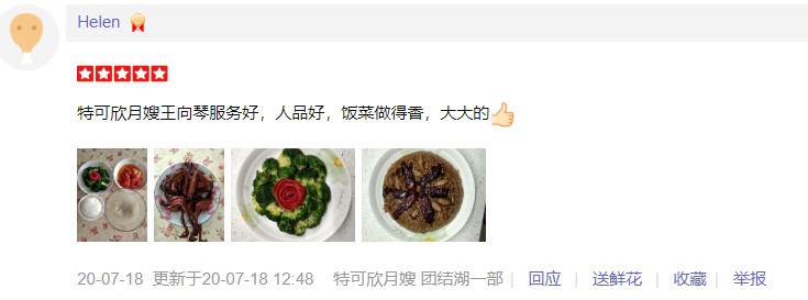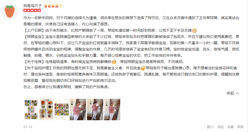 2014年从业特可欣,性格温和 ,做事认真,有责任心。擅长催乳 煲汤 产妇及婴儿护理。 产妇技能:子宫复旧,恶露观察,产褥汗的科学指导,形体及体能康复等; 婴儿护理技能:洗澡,抚触,脐部消毒,被动操,排气操,大小便的观察,啼哭观察等 ;婴儿常见疾病的观察及预防指导:如臀红、湿疹、黄疸等;