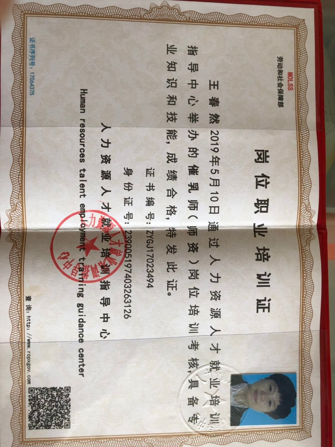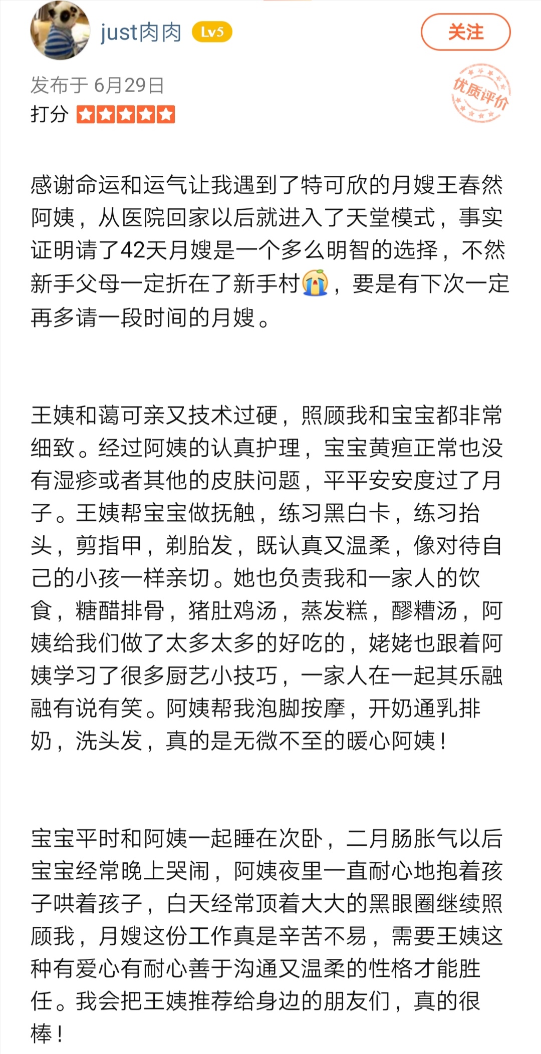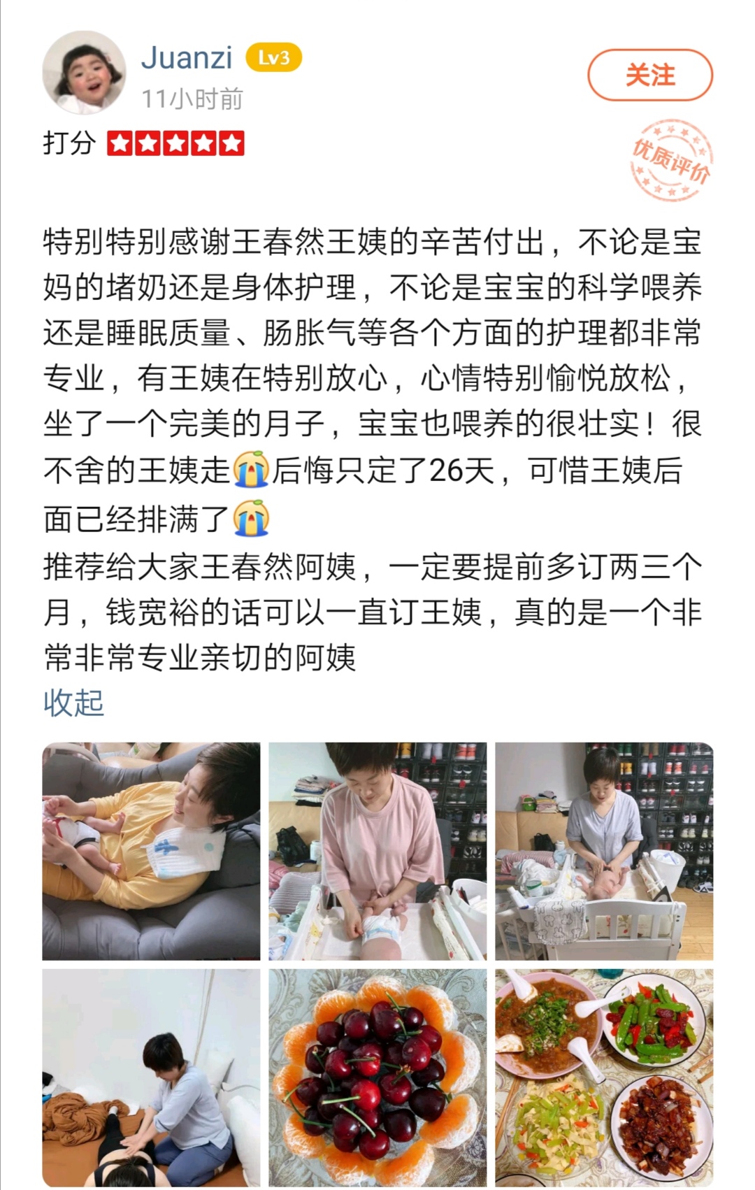 2012年从业特可欣,性格开朗,有责任心有耐心。可带双胎及早产儿。产妇护理技能:催乳,月子餐营养搭配,产褥期科学指导、恶露的观察、子宫复旧等;婴儿护理技能:洗澡、游泳、被动操、排气操、抚触、脐带消毒、黄疸观察、湿疹、臀红的护理等。