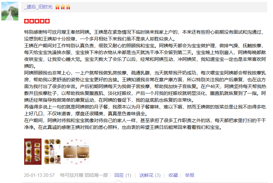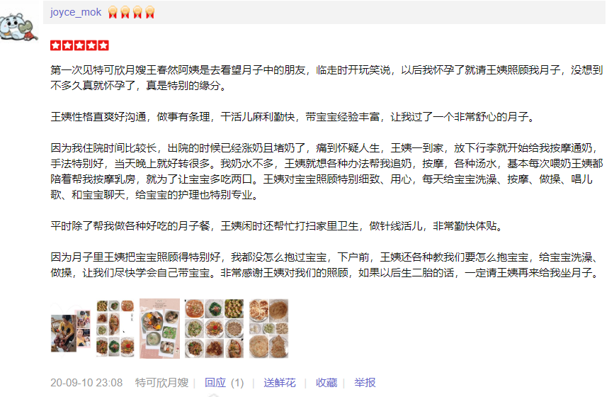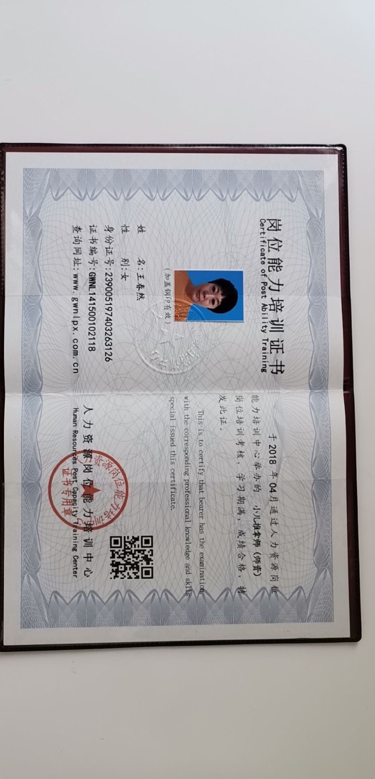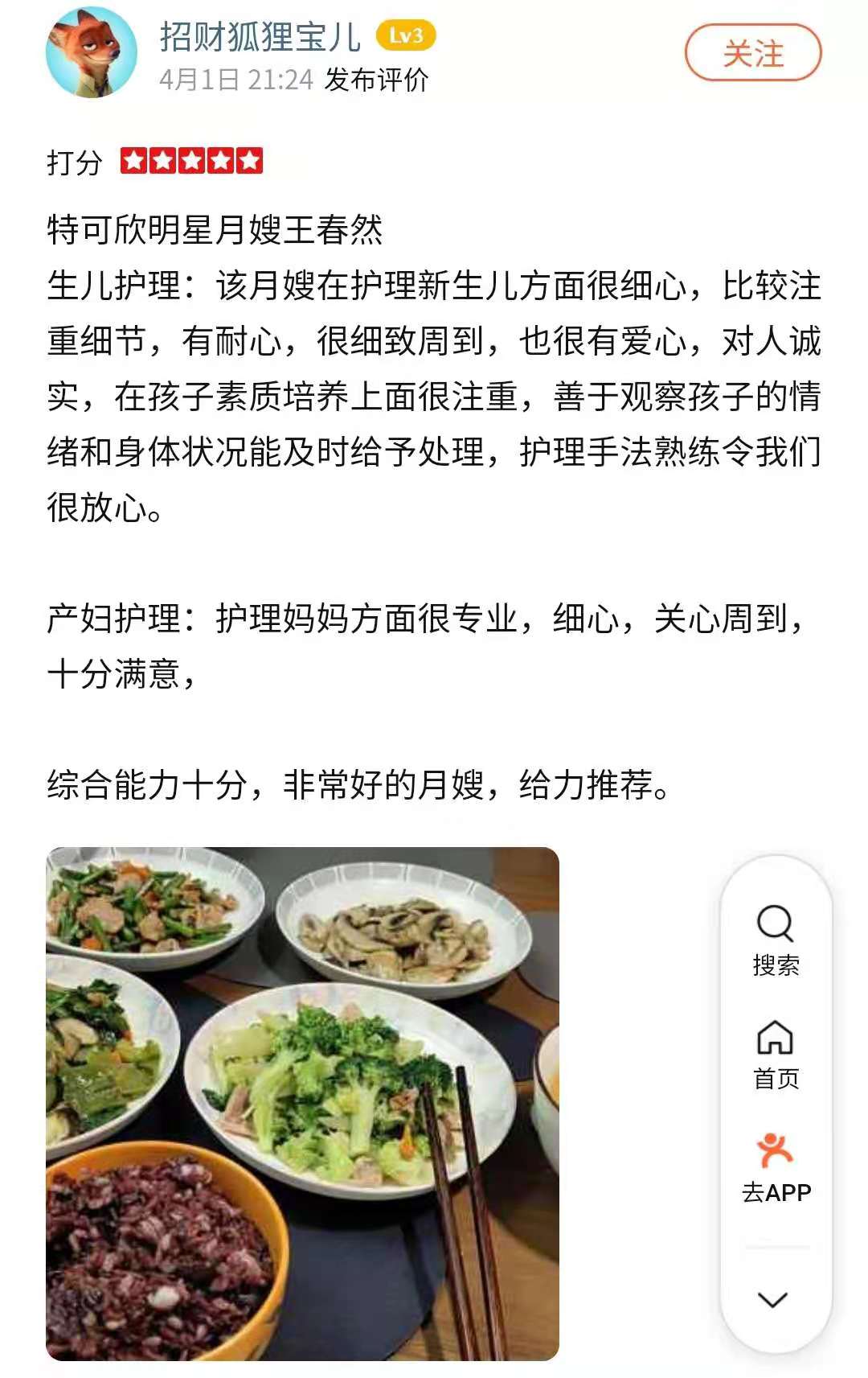 2012年从业特可欣,性格开朗,有责任心有耐心。可带双胎及早产儿。产妇护理技能:催乳,月子餐营养搭配,产褥期科学指导、恶露的观察、子宫复旧等;婴儿护理技能:洗澡、游泳、被动操、排气操、抚触、脐带消毒、黄疸观察、湿疹、臀红的护理等。
