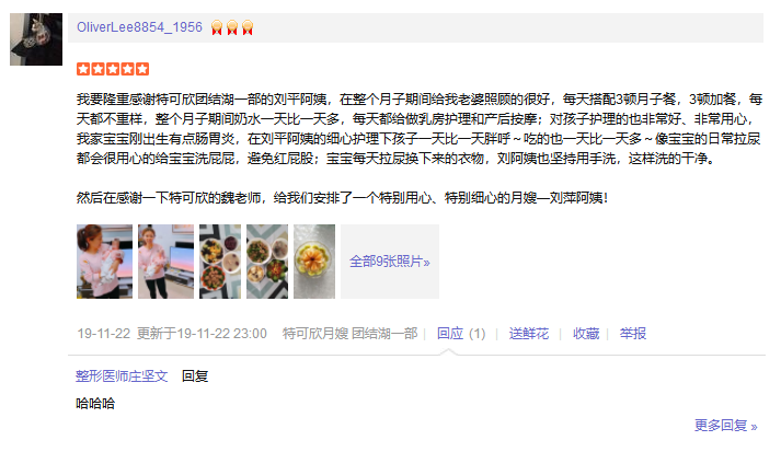 2016年加入特可欣,性格开朗,喜欢宝宝,有耐心,责任心。擅长煲汤,产妇及婴儿护理。 产妇护理技能:月子餐制作,乳房护理,心里疏导,恶露观察,子宫复旧、产褥期的科学指导等。 婴儿护理技能:抚触,被动操,排气操,新生儿常见疾病的观察及预防如:黄疸,湿疹,臀红,尿布疹等。